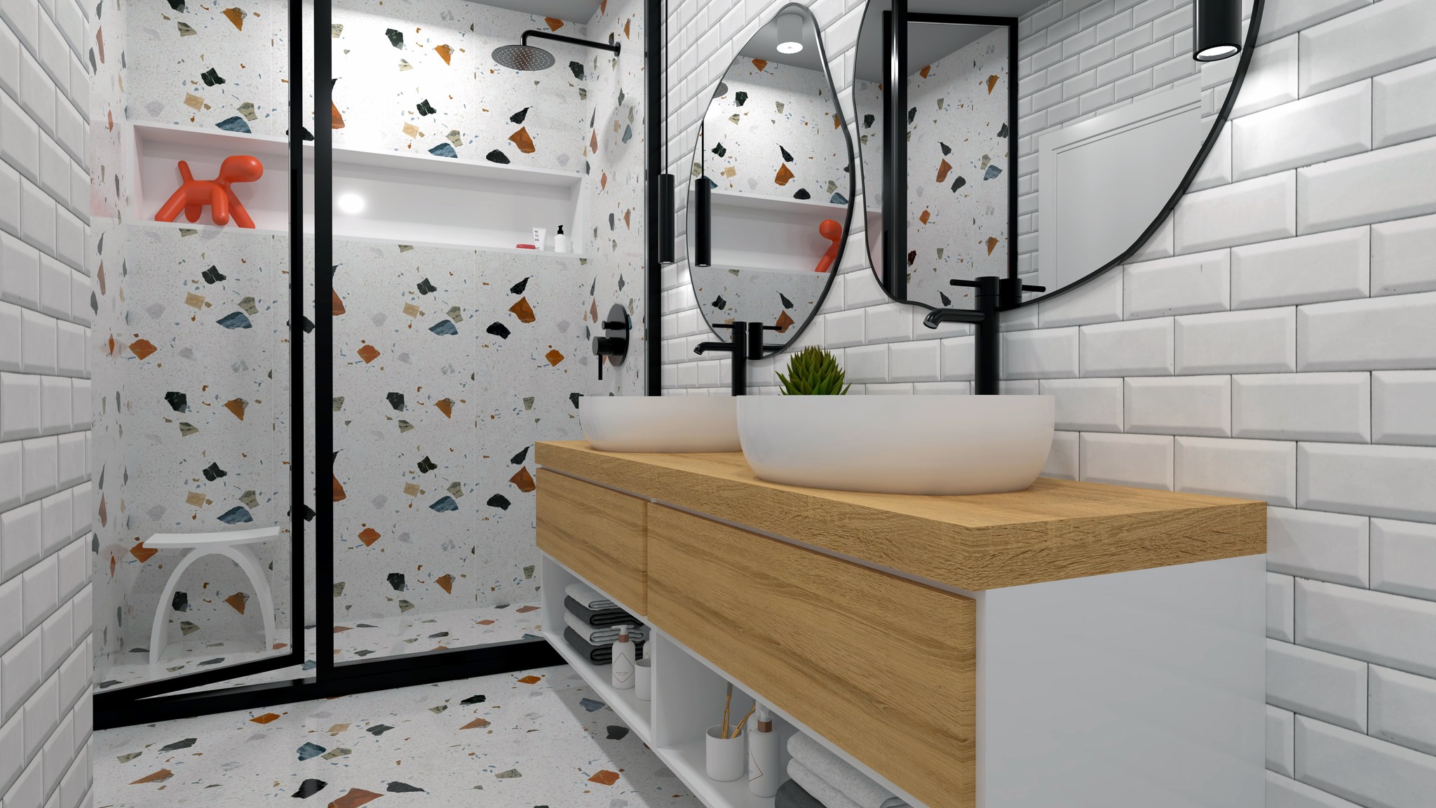 За детската баня са заложени плочки тип терацо за акцент, преобладаващ цвят на останалите е бял - за чистота и акцентни черни смесители и душ за вграждане. Банята разполага с широка душ-кабина и двойна мивка.