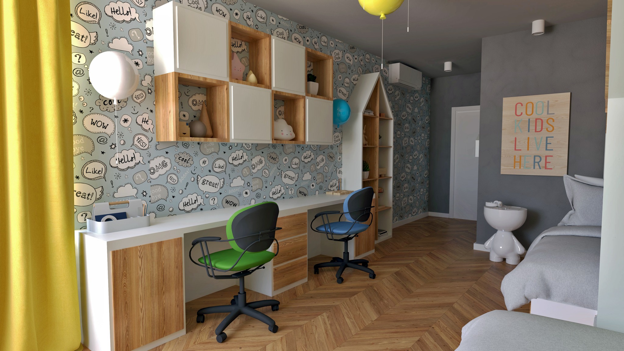 В стаята на близнаците има по-игрив интериор, подходящ за детското въображение. Най-дългата стена е акцентна, решена с тапет в стил комикс в момчешки цветове. Леглата са комбинирани с корпусната мебел за съхранение, във формата на две къщи за повече игривост, но достатъчно големи, за да използват напред във времето. Осветлението е дизайнерско, имитиращо балони в различни цветове. Бюрото е двойно с достатъчно дължина за комфорт при учене едновременно и на двете деца.