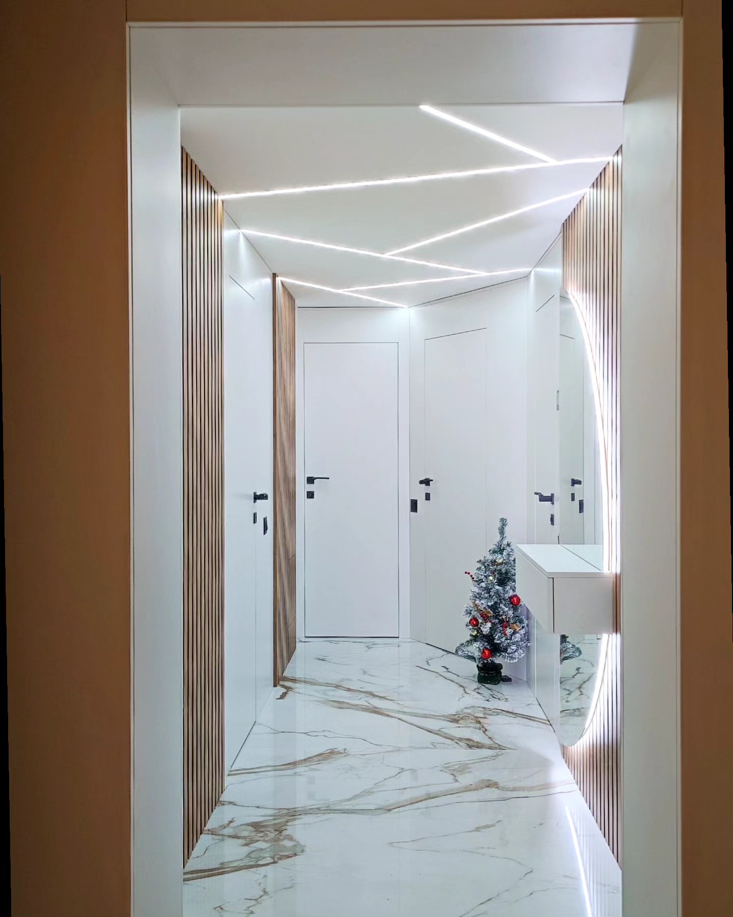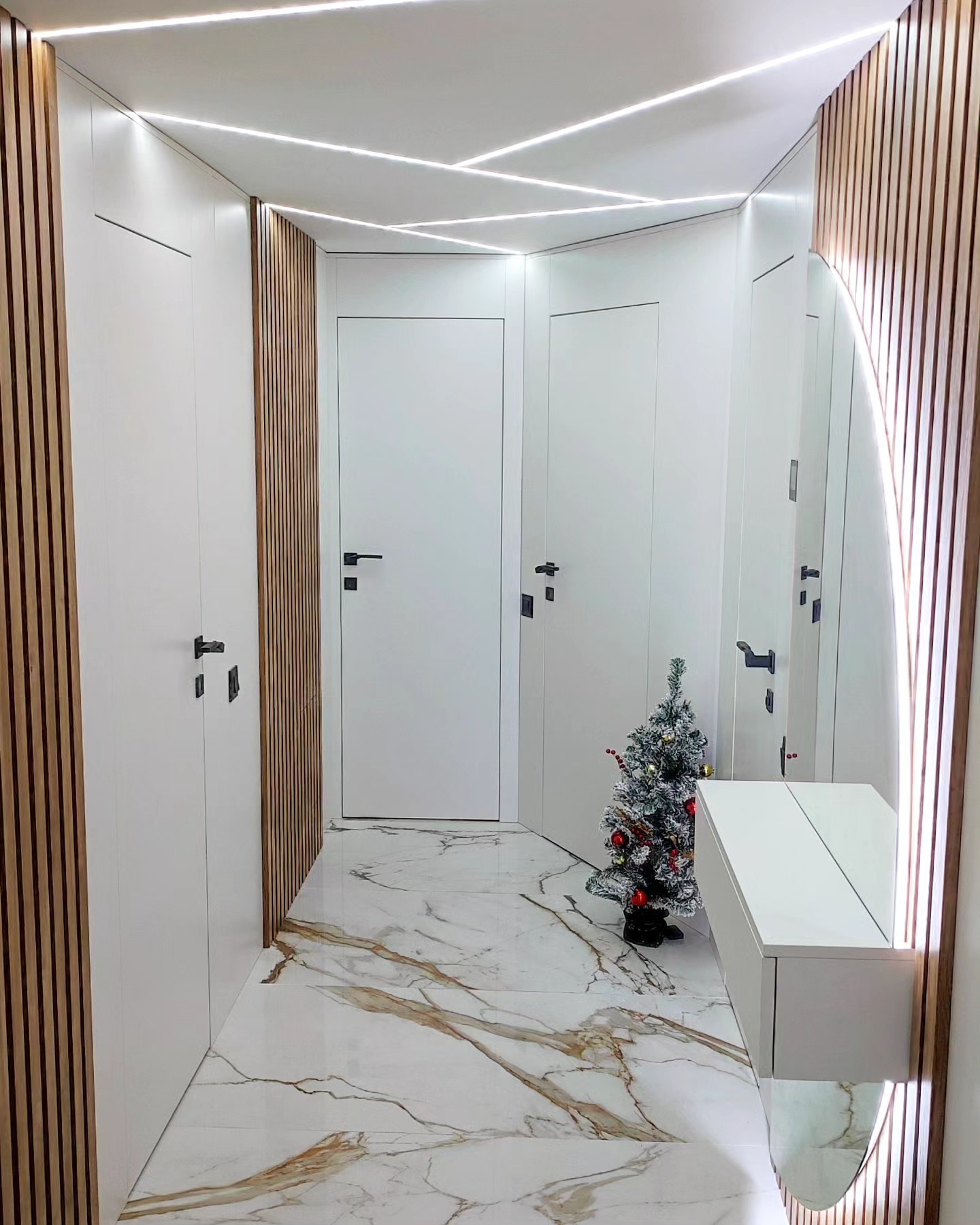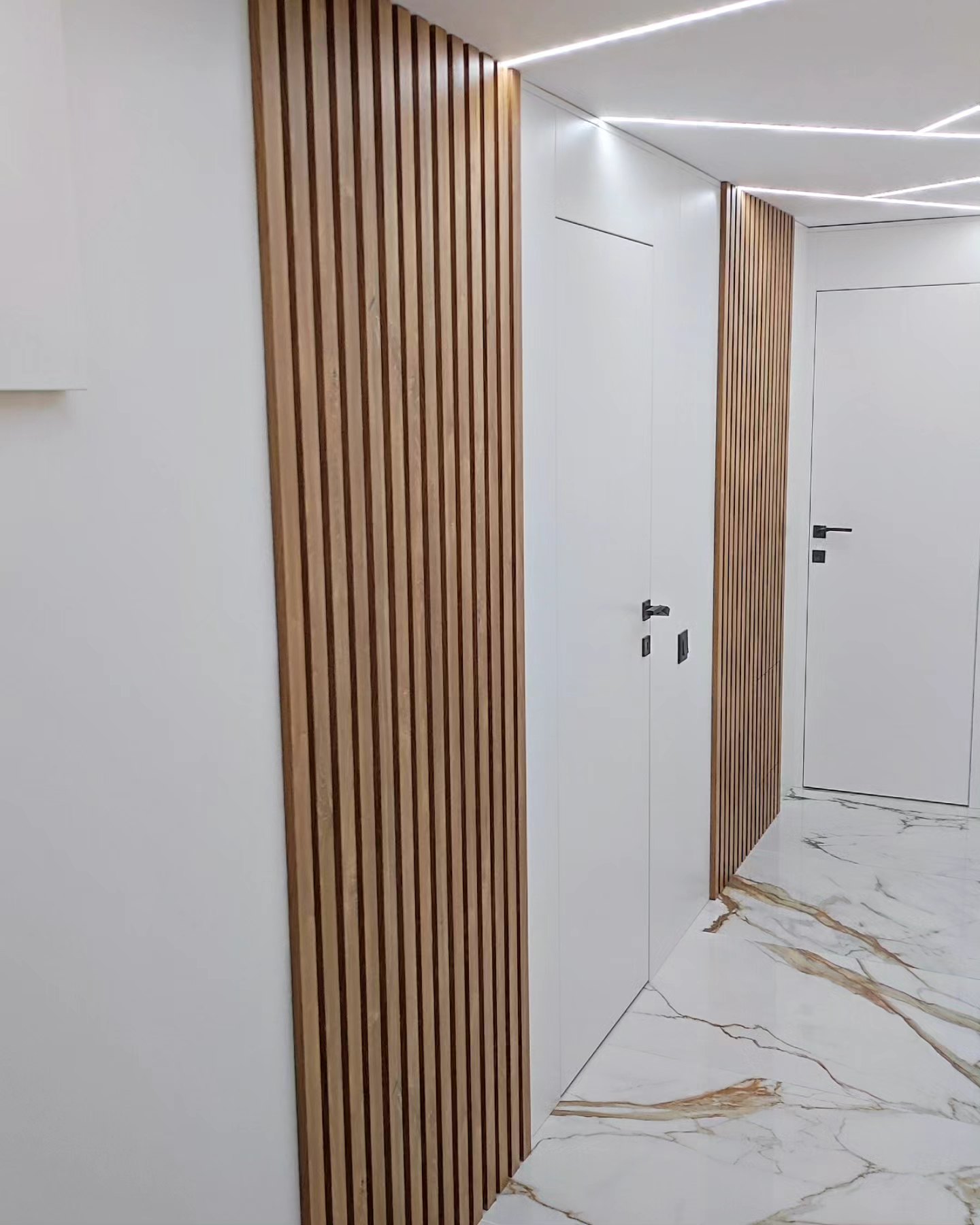 Реализацията на проект за коридор в модерен изчистен стил с тапетни врати, ламперия в цвят по RAL и дървесен растер за разчупване на визията