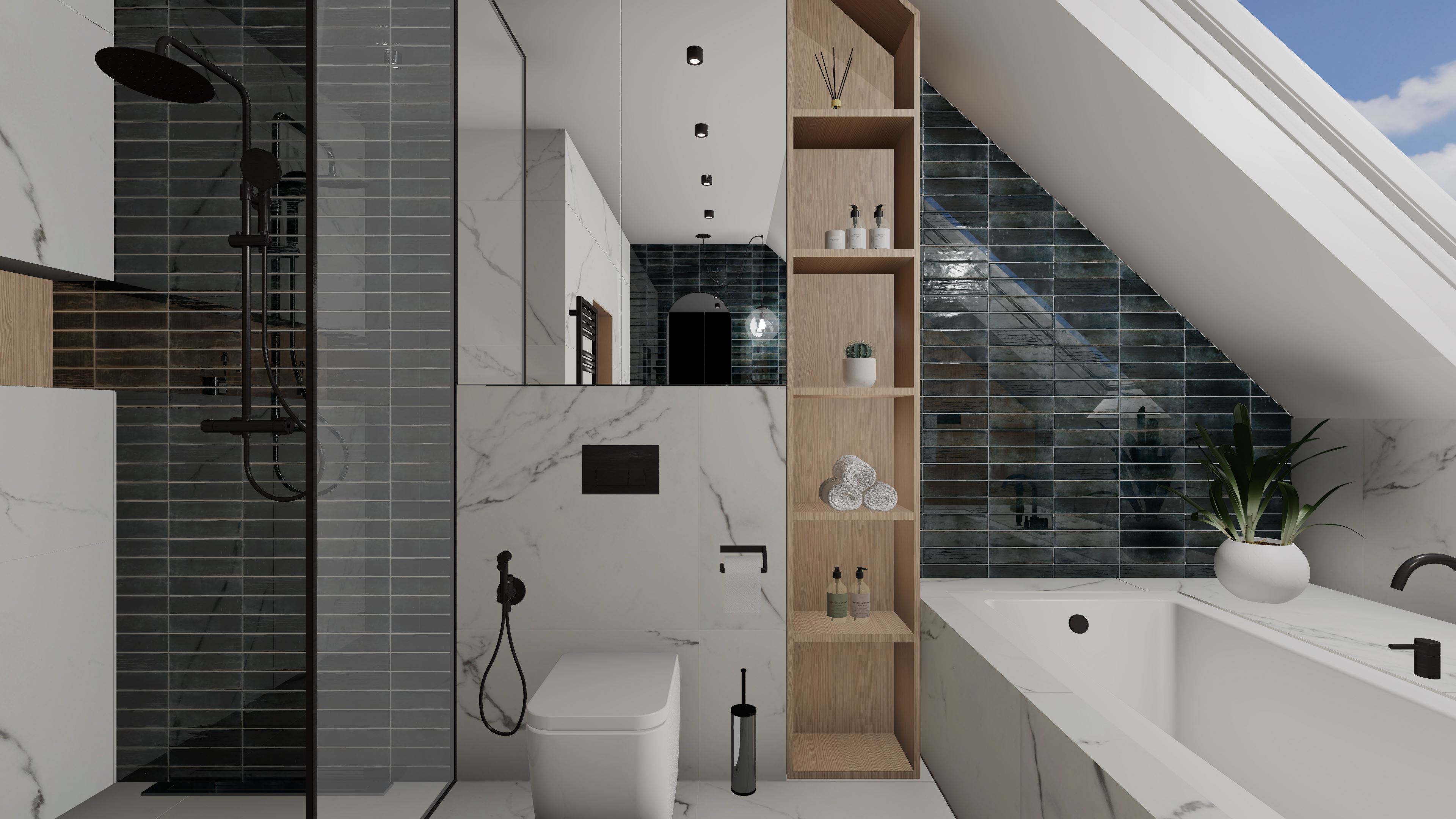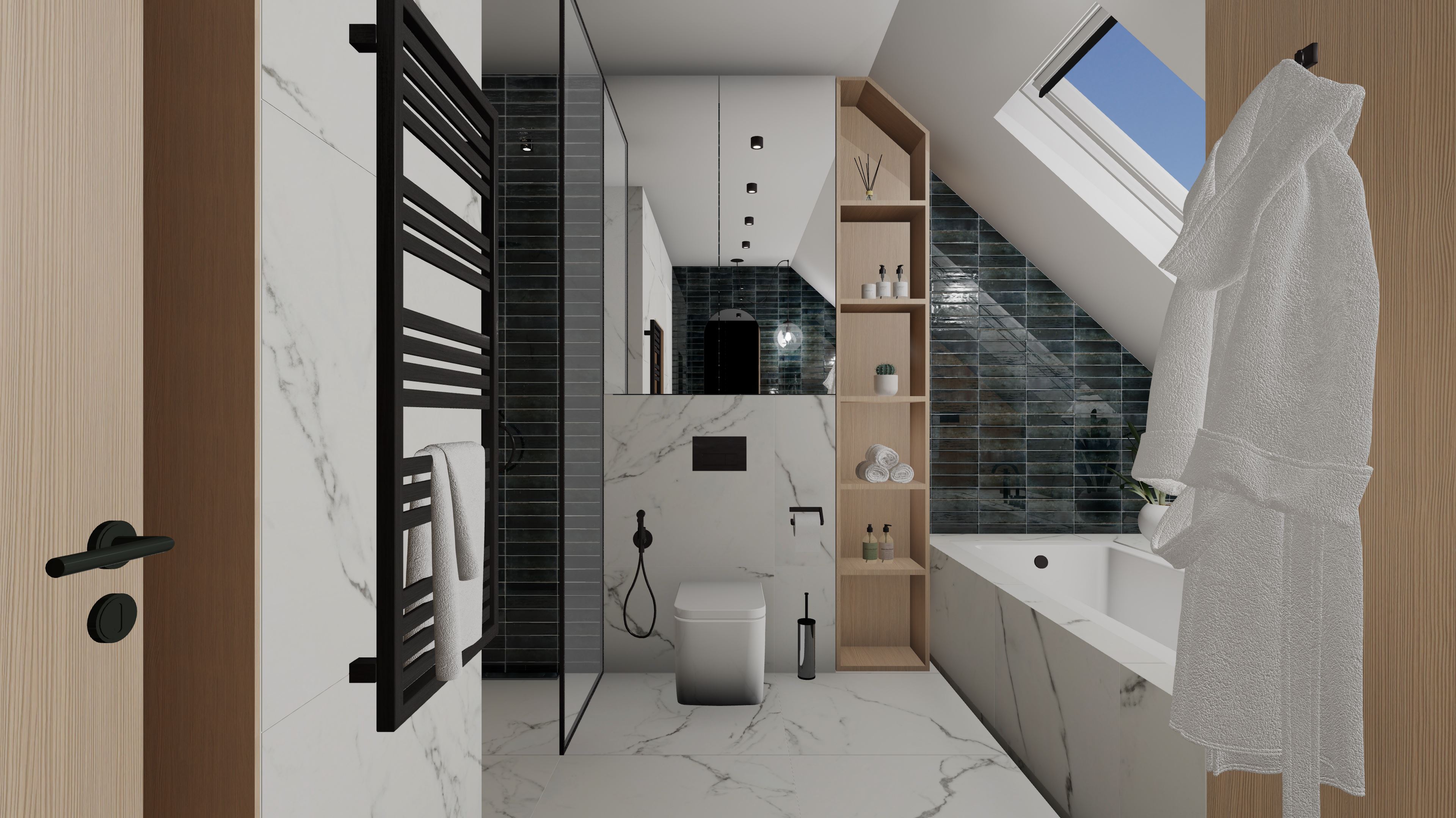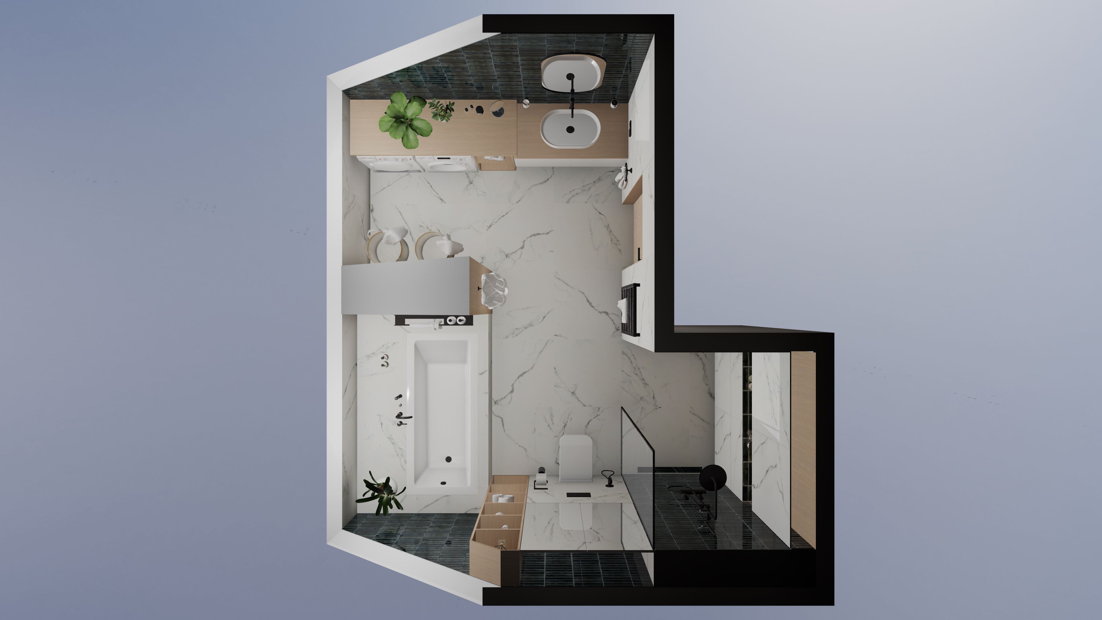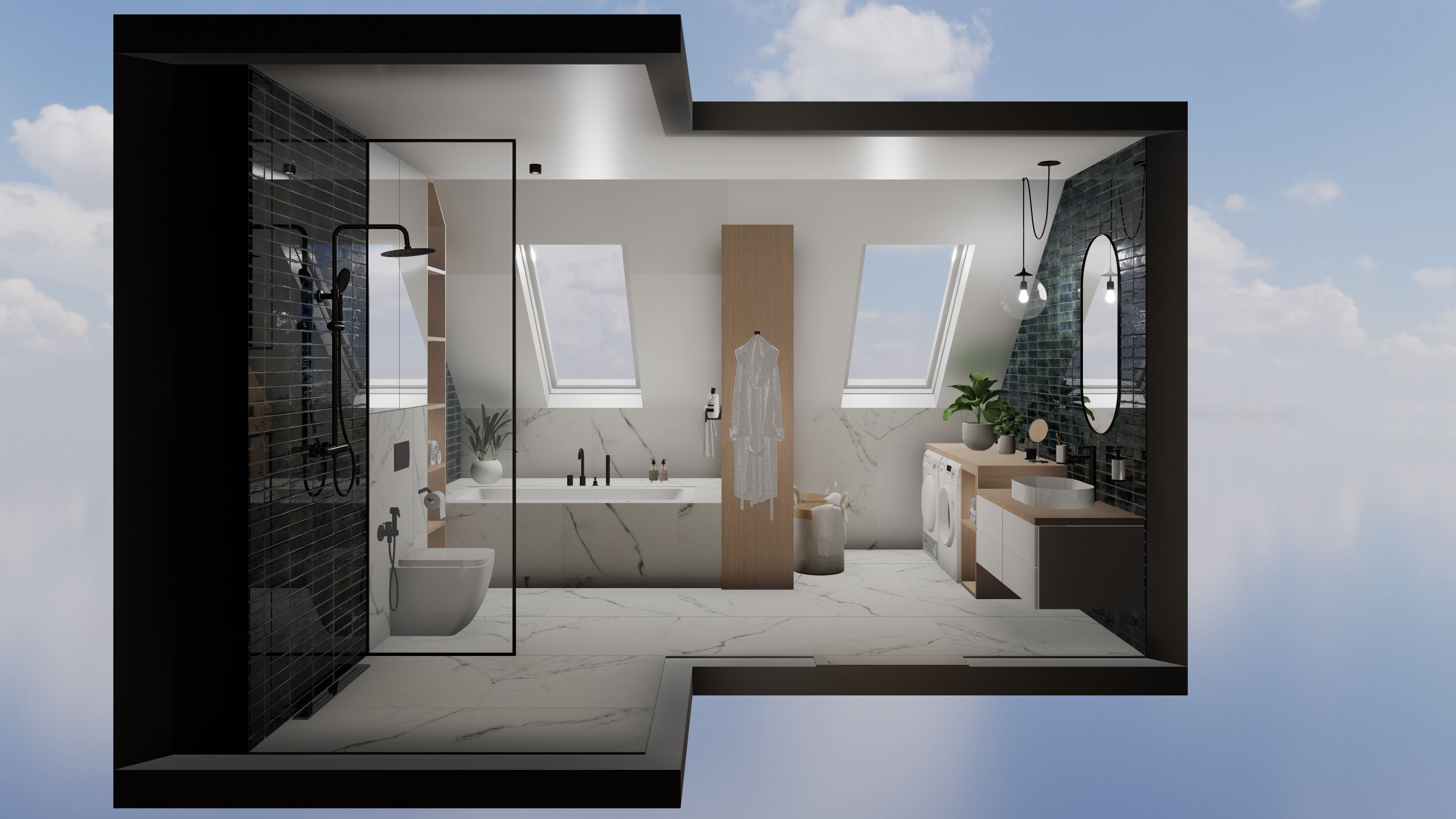 Този проект е 3D визуализация на модерна баня в стил лофт.