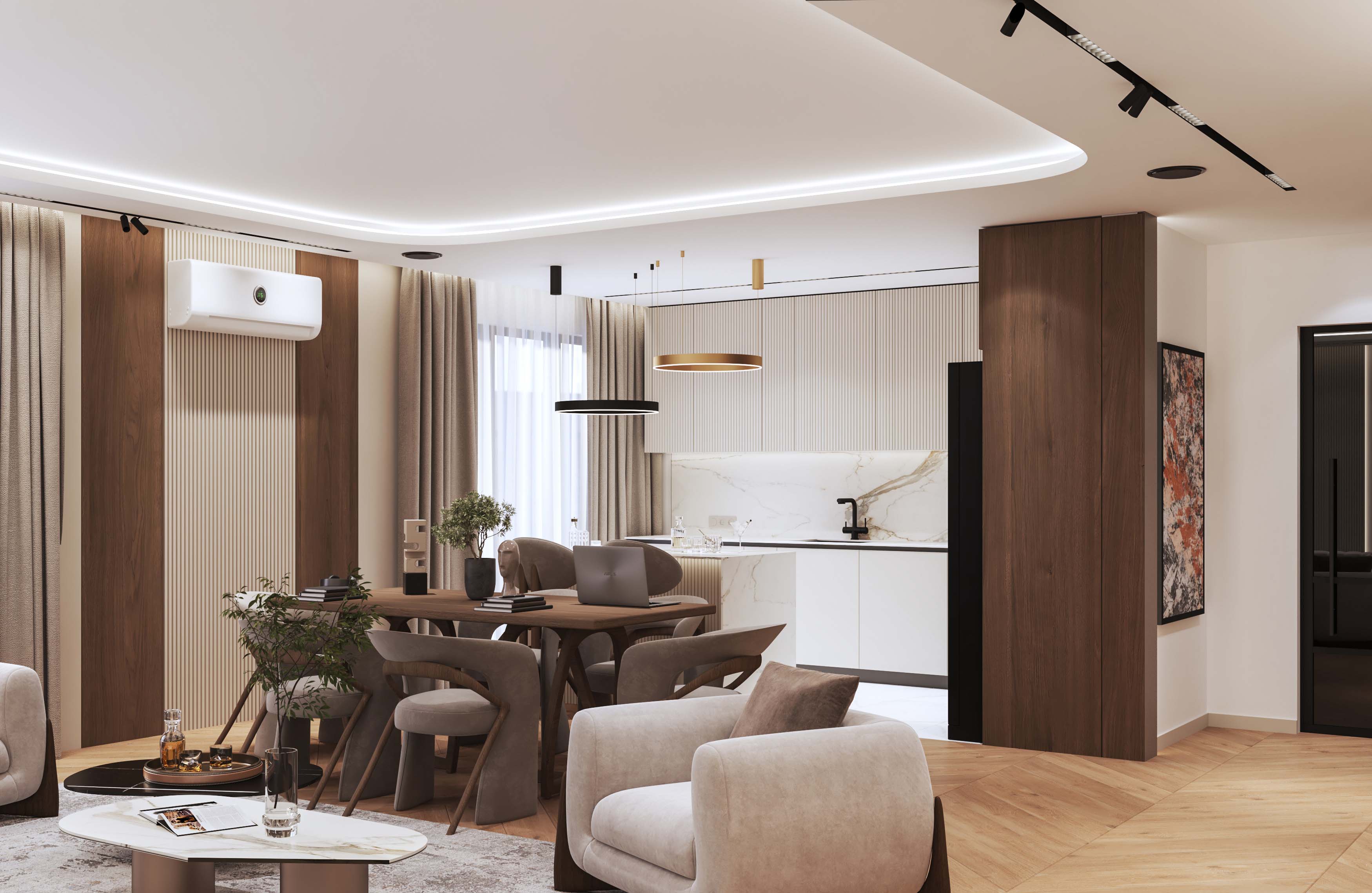 Перфектният баланс между топли тонове, текстури с модерен стил и мебели по поръчка, проектирани така, че всяка стая да има собствен ритъм – без да губи връзката с цялостната концепция.