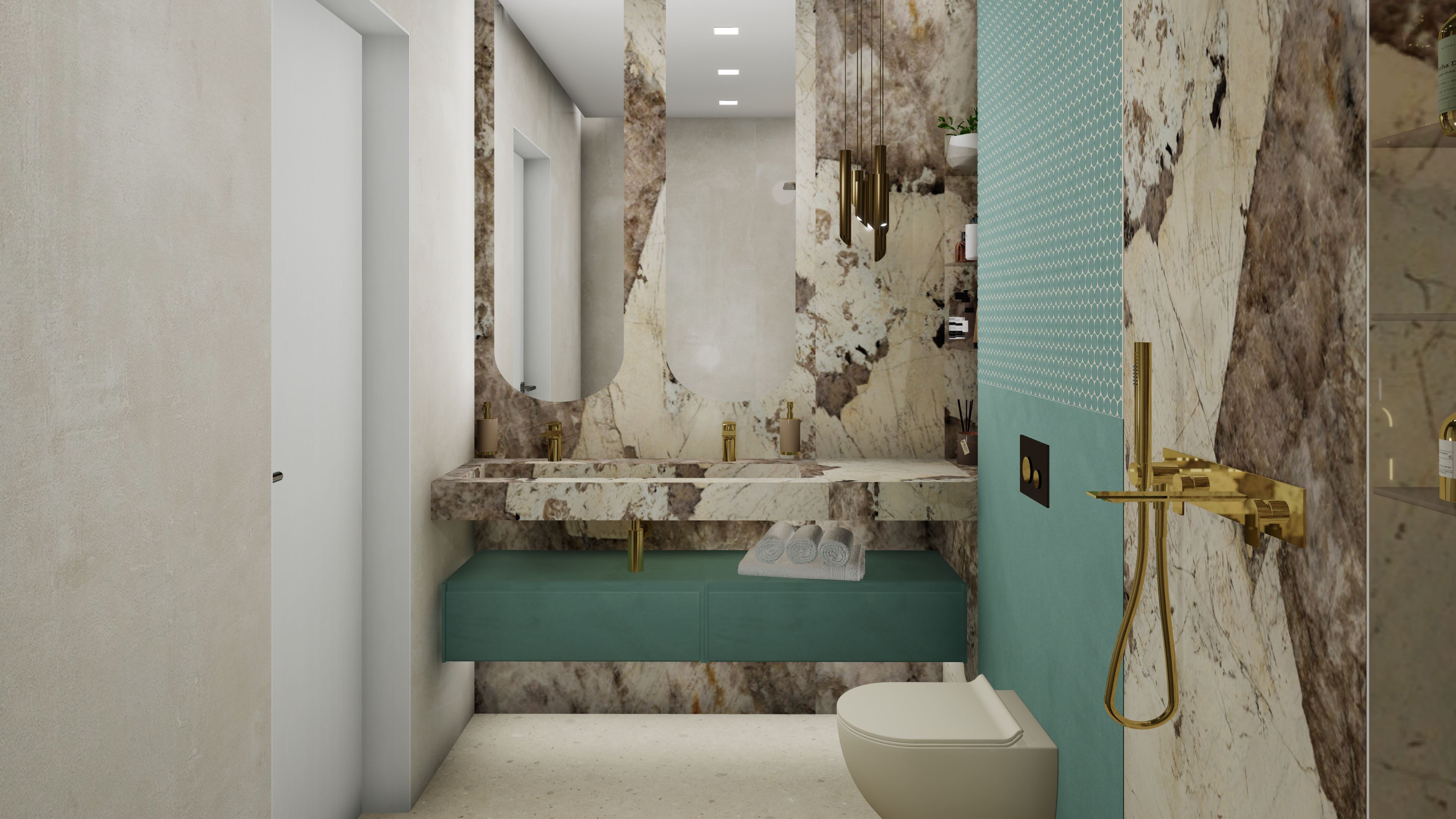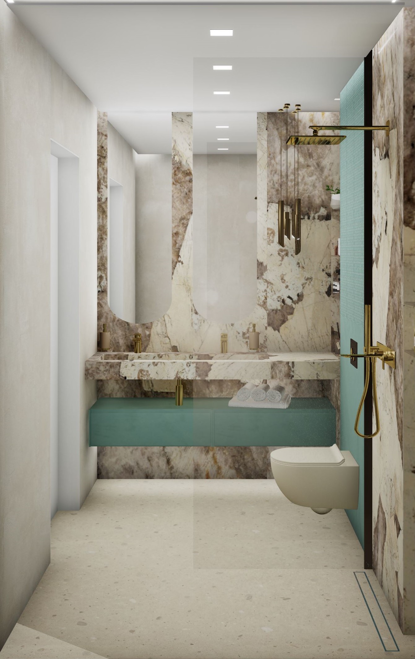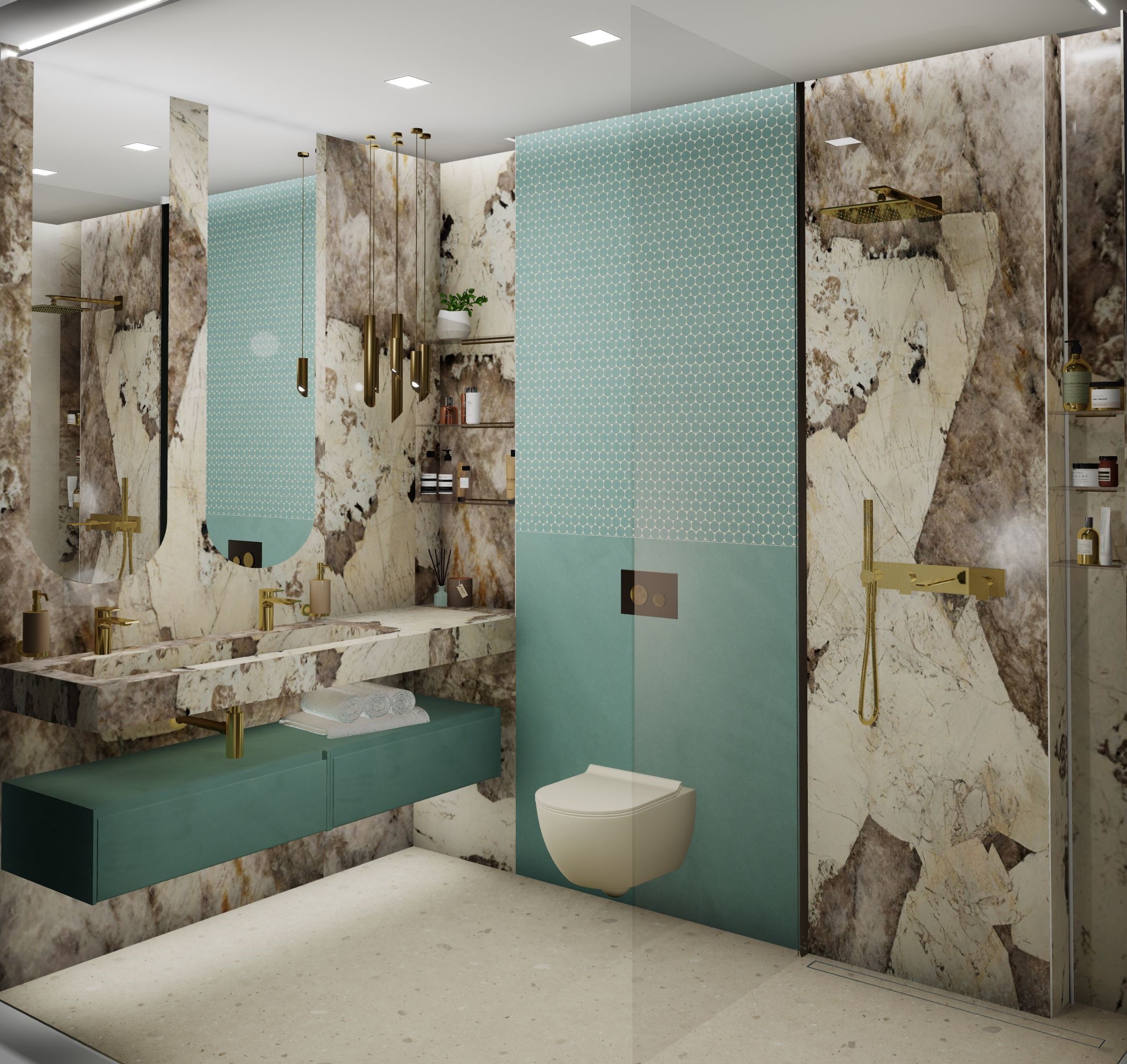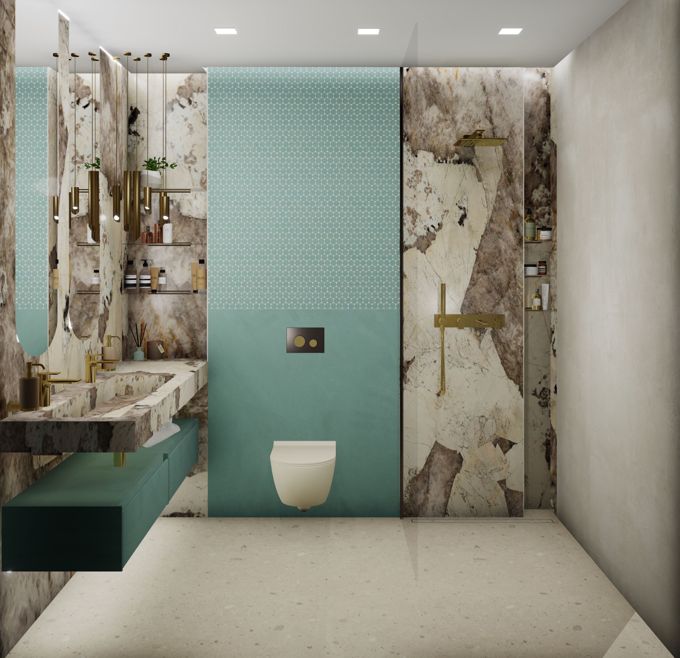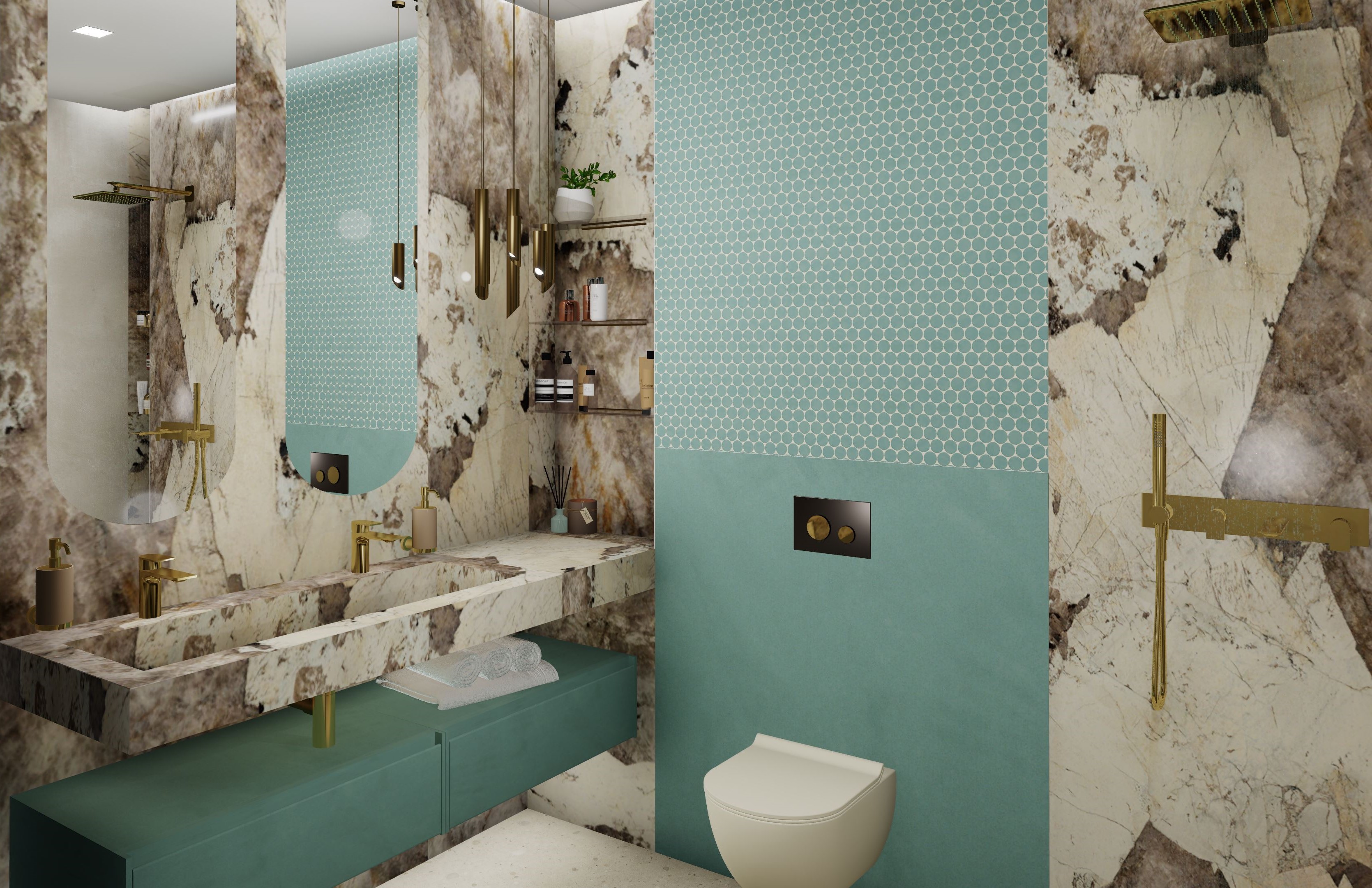 Rest Art Green е баня, в която естествената текстура на камъка се среща с артистична композиция и успокояващи тюркоазени тонове. Това не е просто санитарно пространство – това е убежище, сцена за материали и баланс между смелост и мекота. Контрастът между суровите жилки и изчистената геометрия създава визуална поезия, която говори за модерна естетика. Златните акценти и фините детайли подчертават усещането за елегантност, без да претоварват пространството. Това е баня, проектирана за сетивата.
