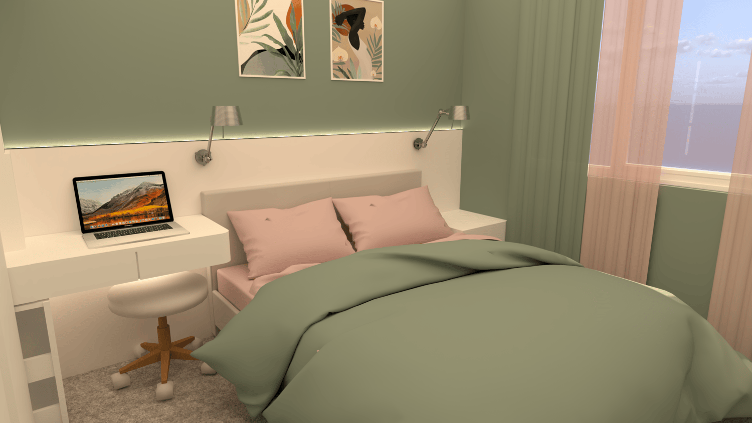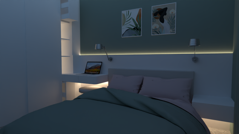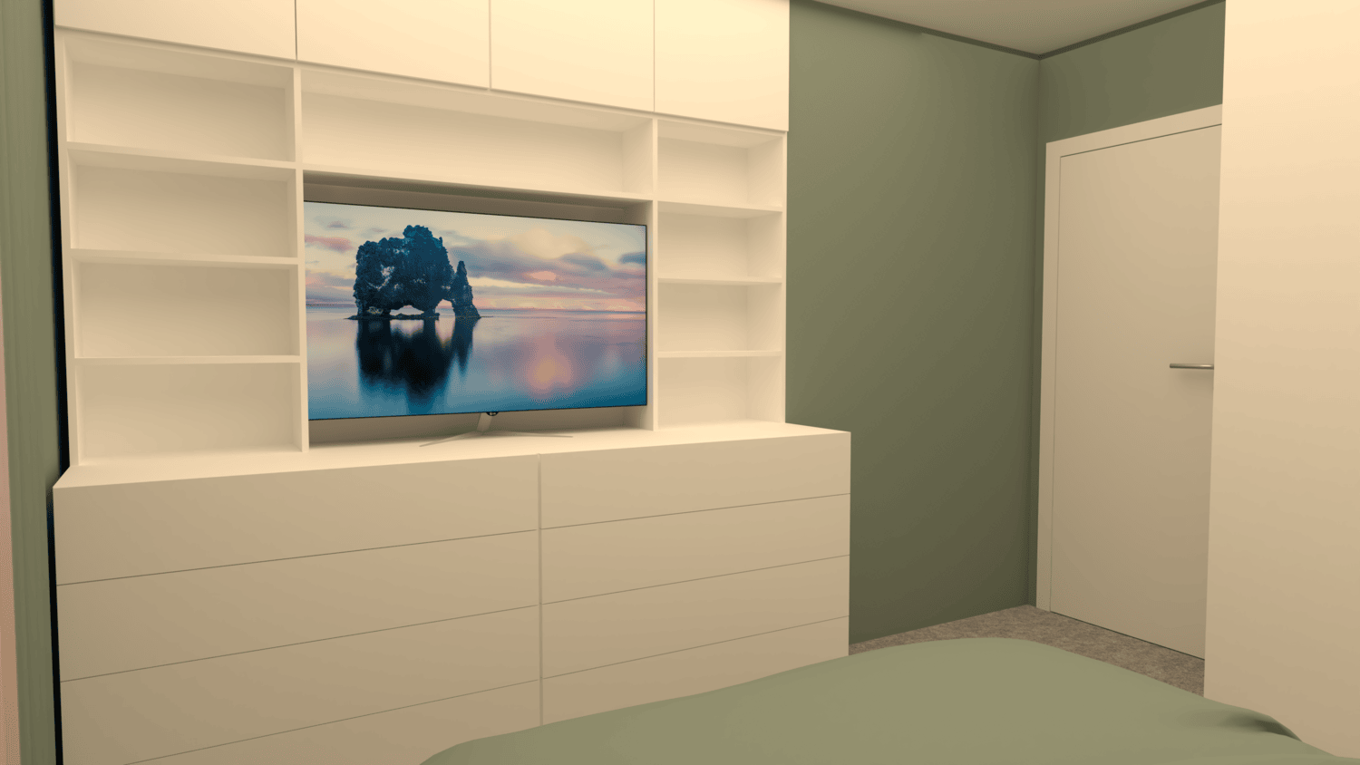 Основен приоритет тук отново е функционалното съхранение, без компромис с уюта и простора. Затова добавих двоен гардероб, изтеглен до тавана**, скрин с етажерки и допълнителни шкафове, разположени високо, за да не натоварват визуално помещението.