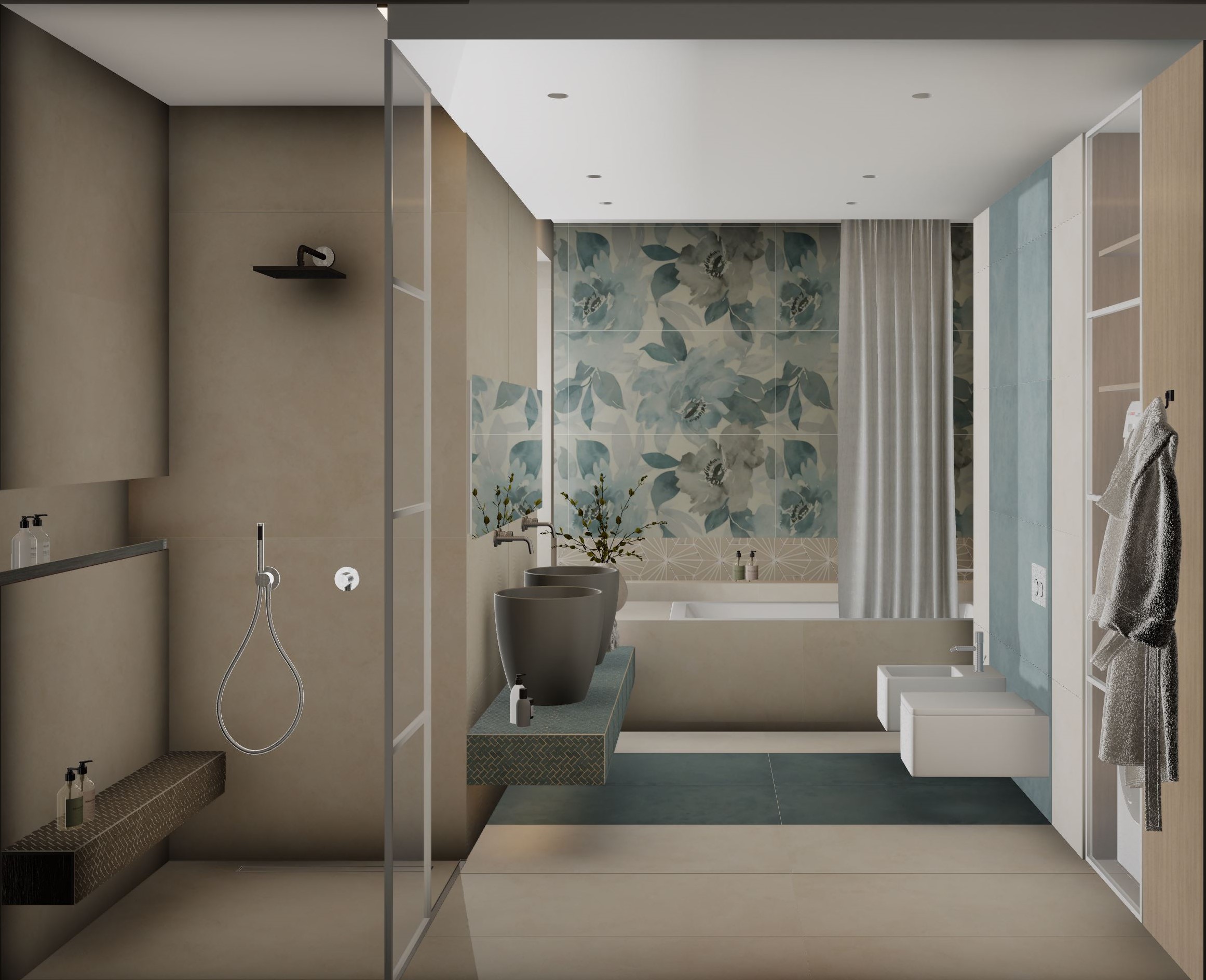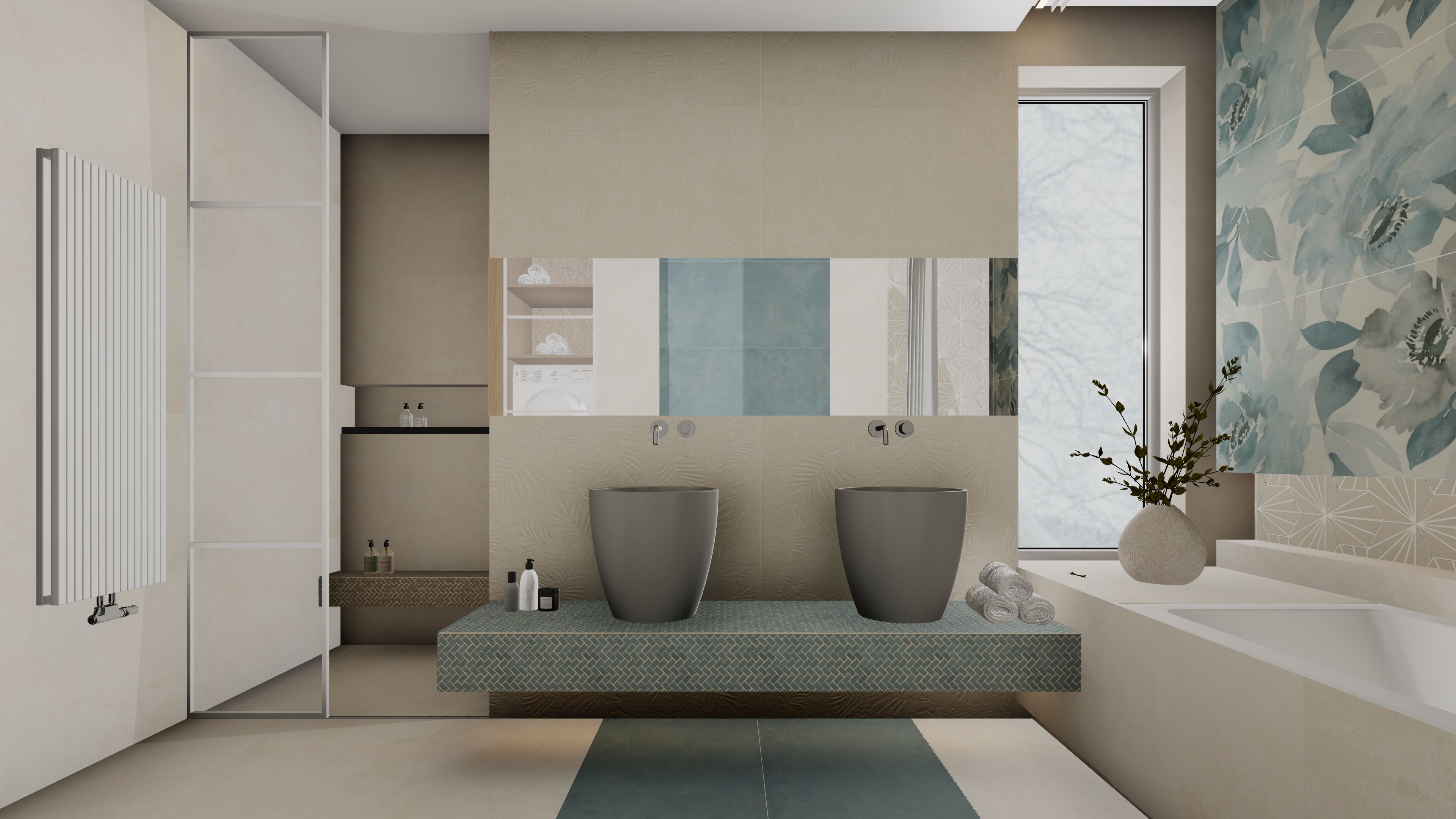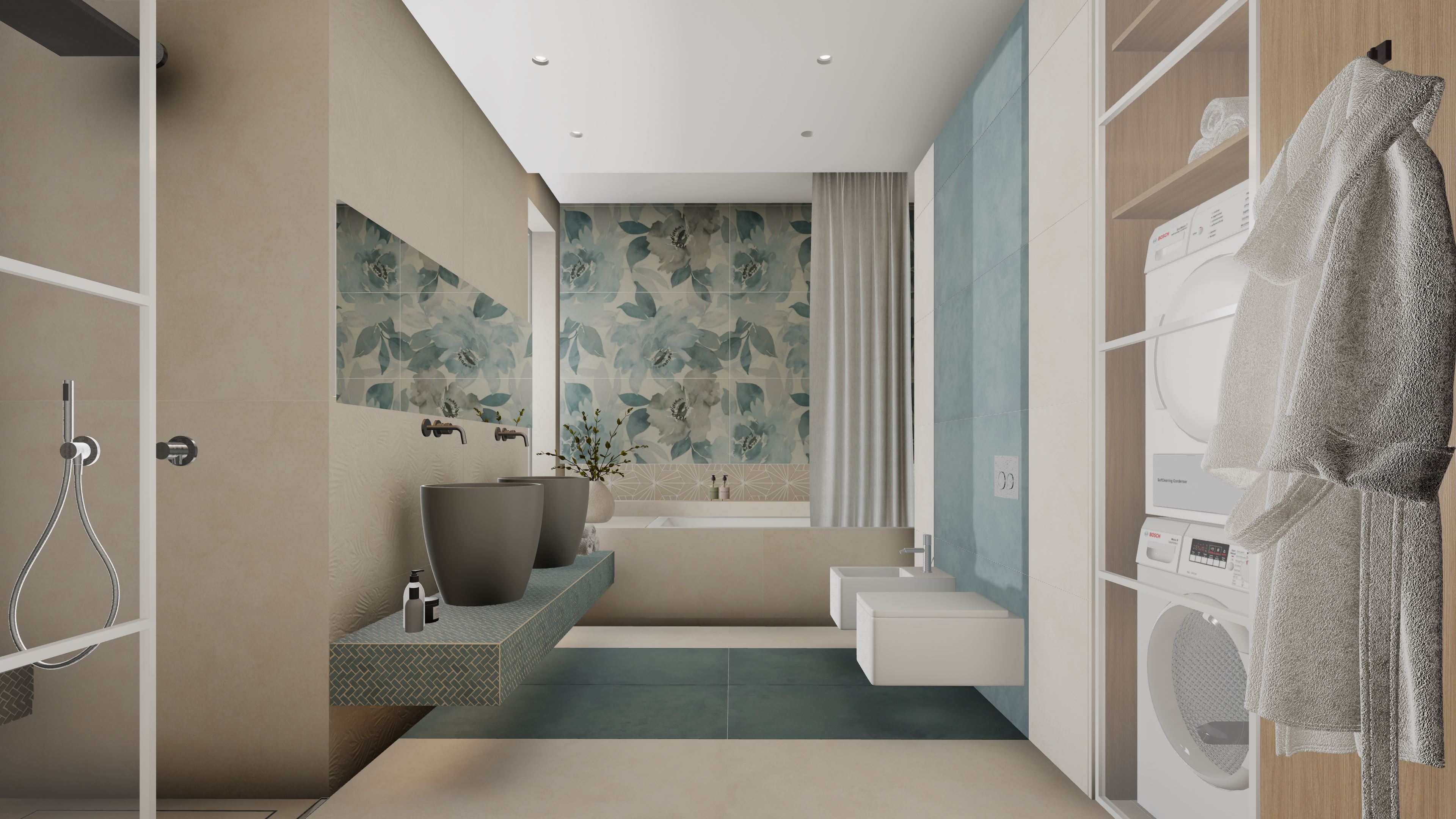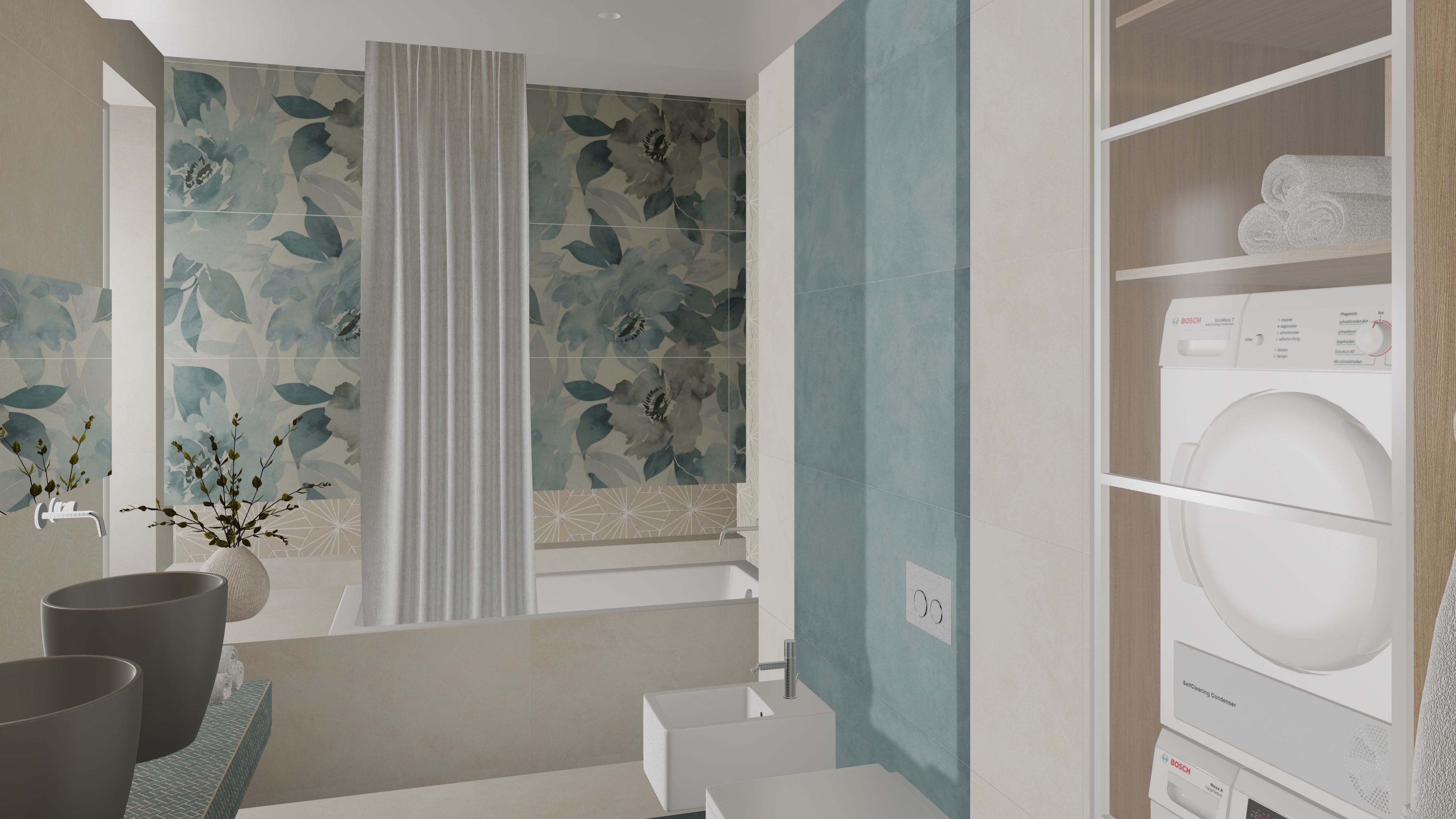 Фокусът е върху изчистени линии, балансирана композиция и хармония между меки тонове и контрастни декоративни елементи.