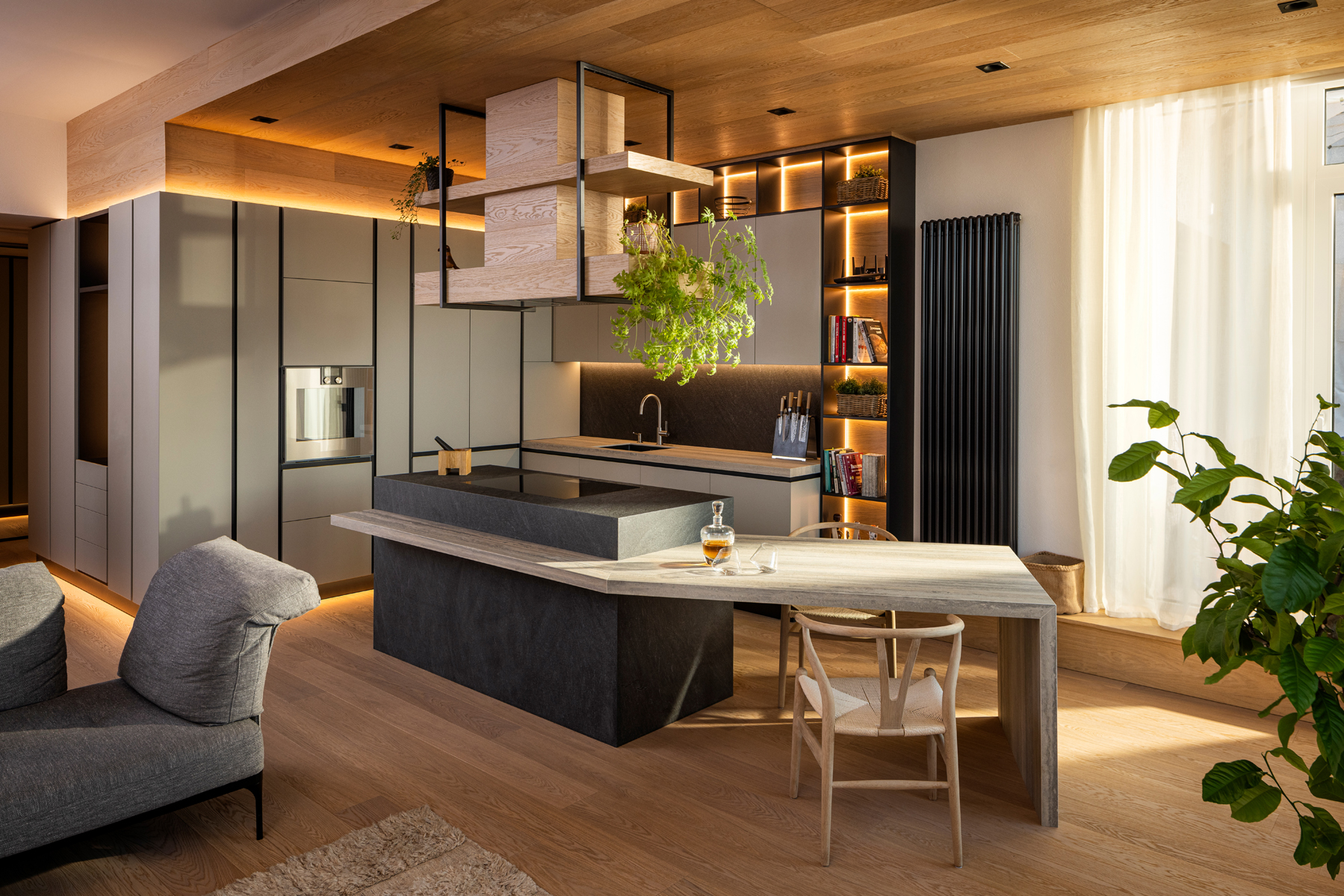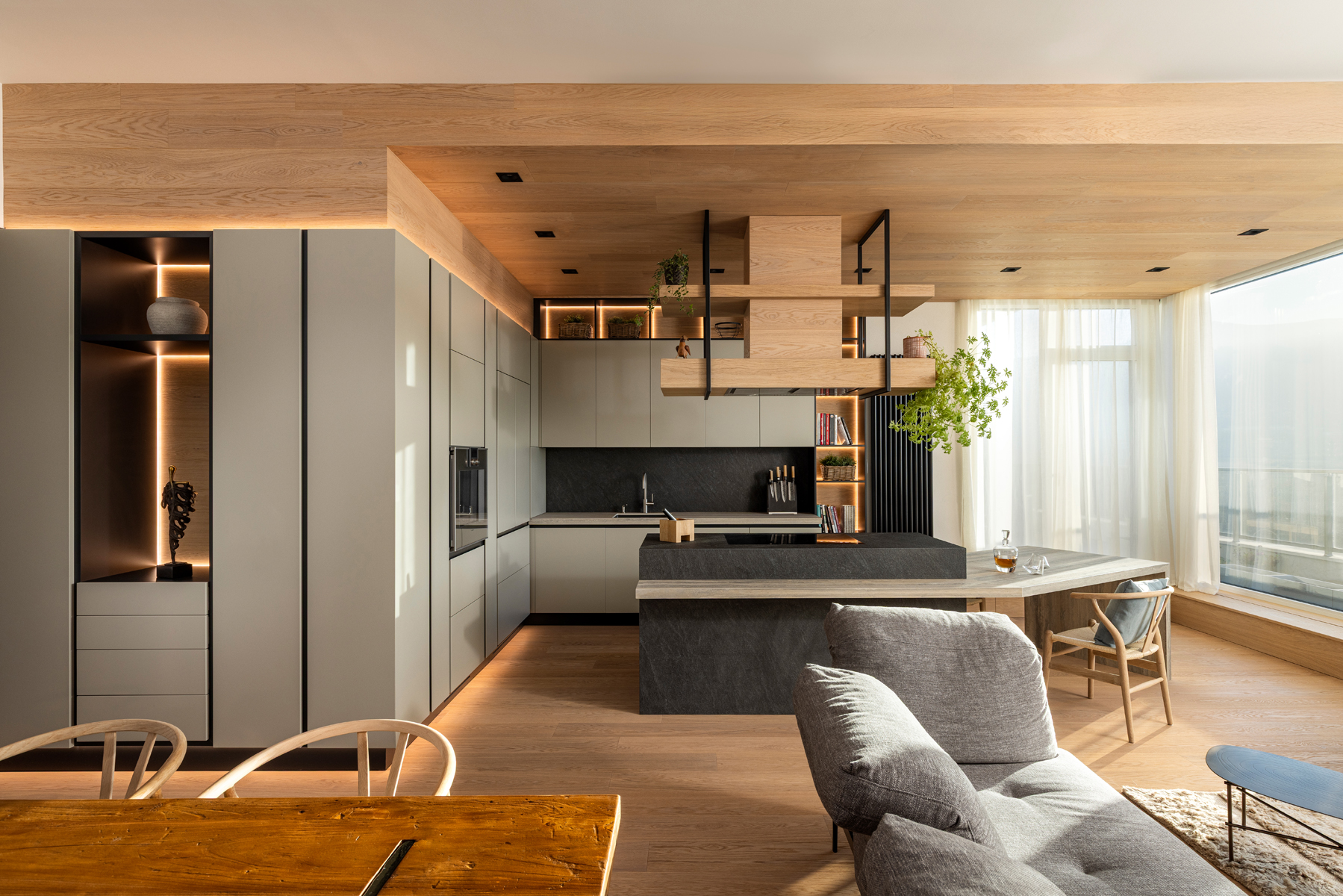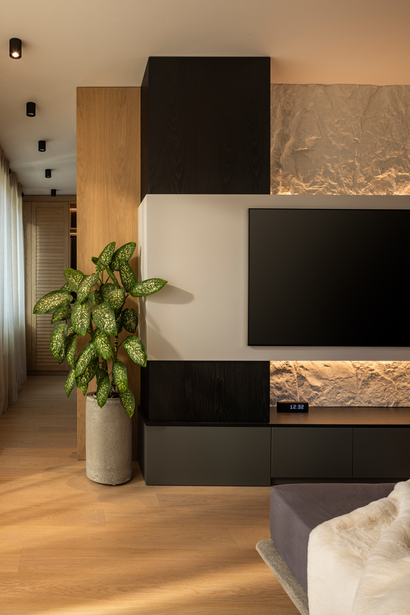 The design focuses on the use of predominantly eco-friendly materials and clean geometries that emphasize perspective and allow the interior to naturally blend with the surrounding environment. Minimalism, comfort, harmony, and well-considered conceptual lighting were the core principles of the project.