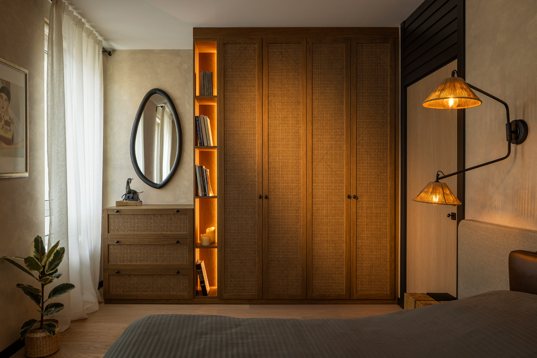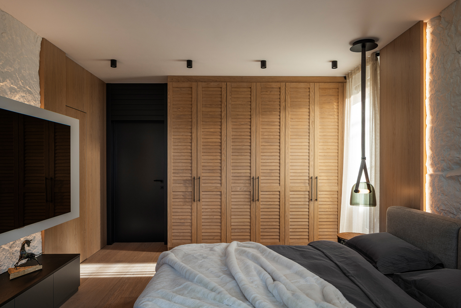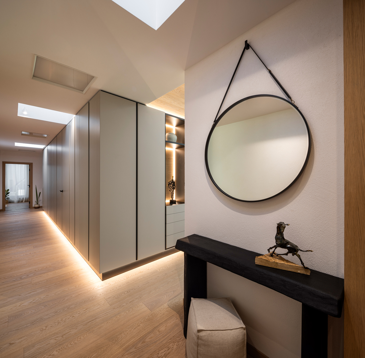 The design focuses on the use of predominantly eco-friendly materials and clean geometries that emphasize perspective and allow the interior to naturally blend with the surrounding environment. Minimalism, comfort, harmony, and well-considered conceptual lighting were the core principles of the project.