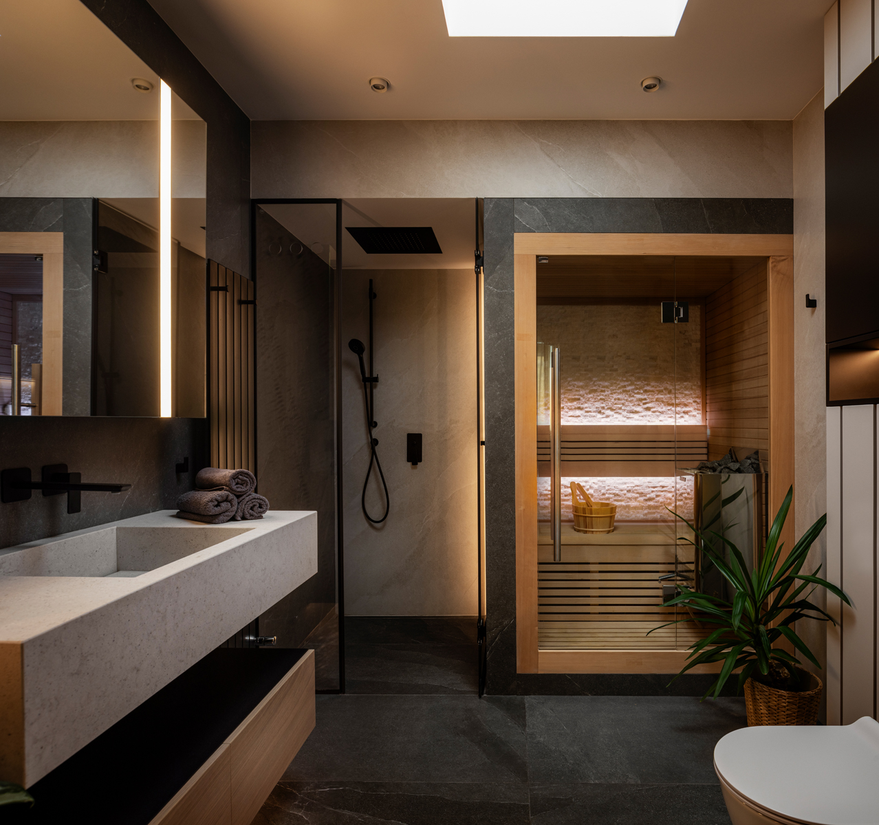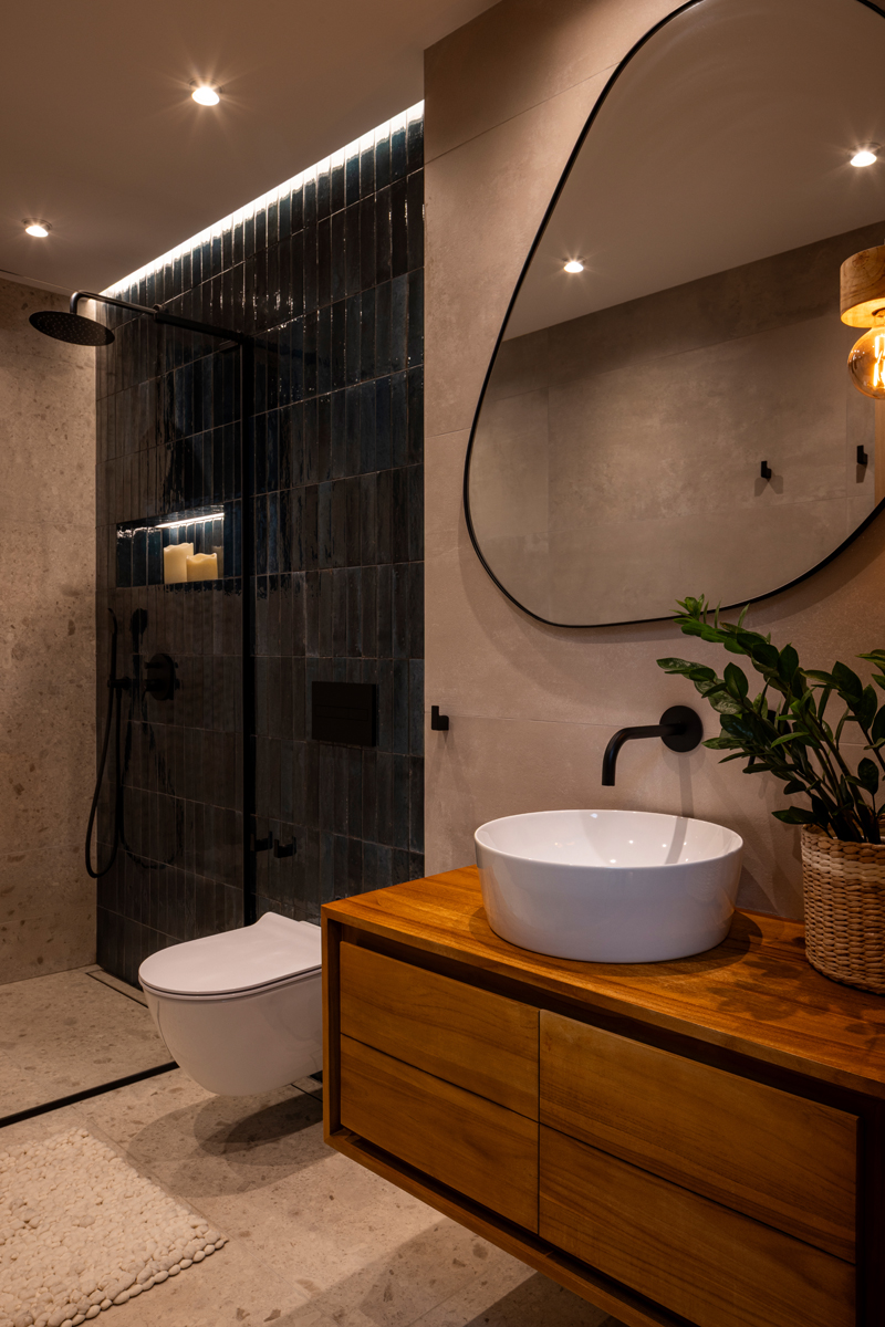 A particular challenge was the integration of a sauna within the bathroom, requiring careful planning and precise execution. Another key element of the project was the creation of a dedicated space for a collection of 200 bottles of malt drinks, aesthetically incorporated into the interior and highlighting the client’s individuality.