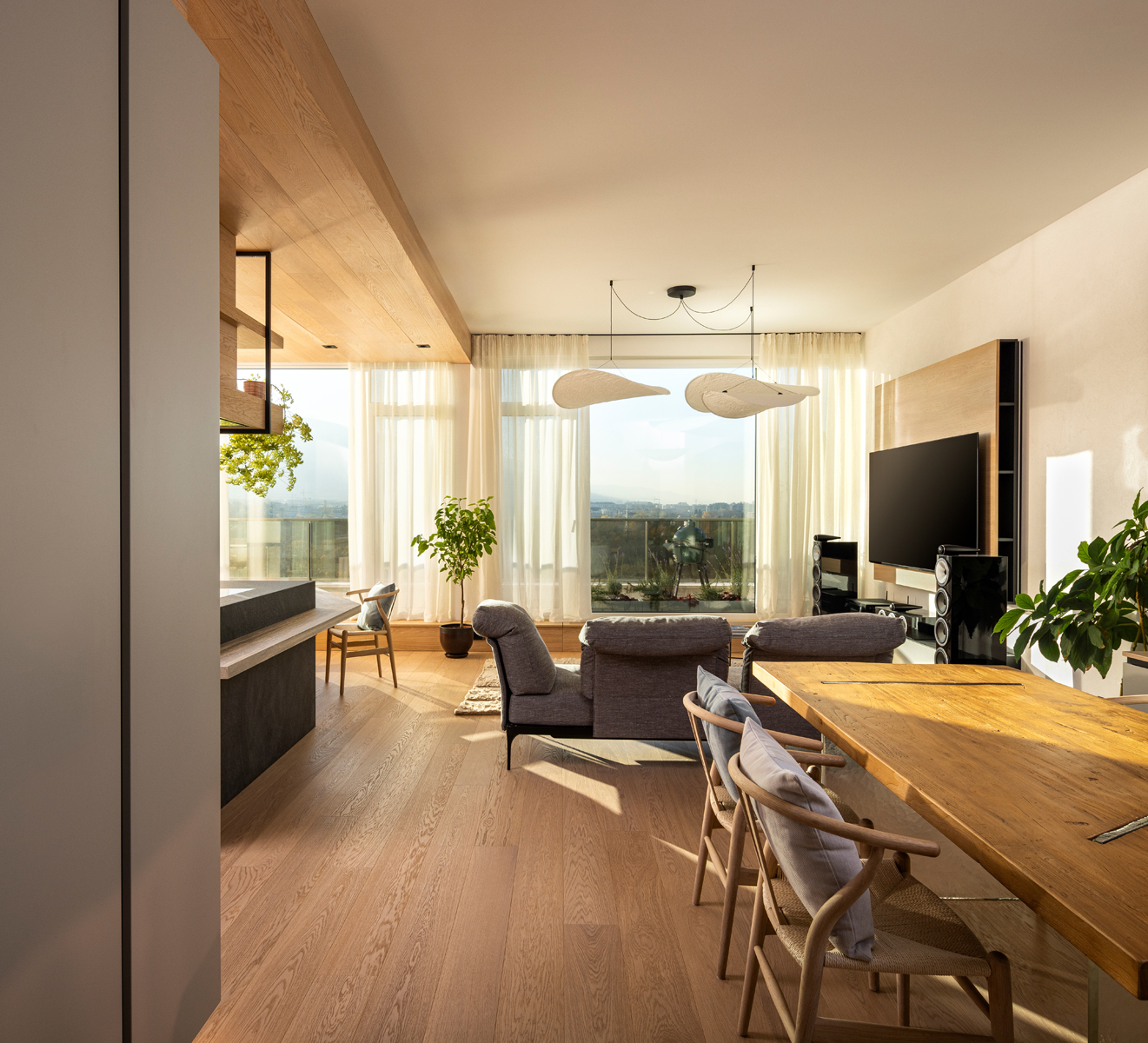 Разположен в София, този апартамент предлага изключителна гледка към града и планината. Архитектурните особености, като светлинни отвори и височина, вдъхновиха концепцията за интериора, съчетаваща функционалност и естетика.