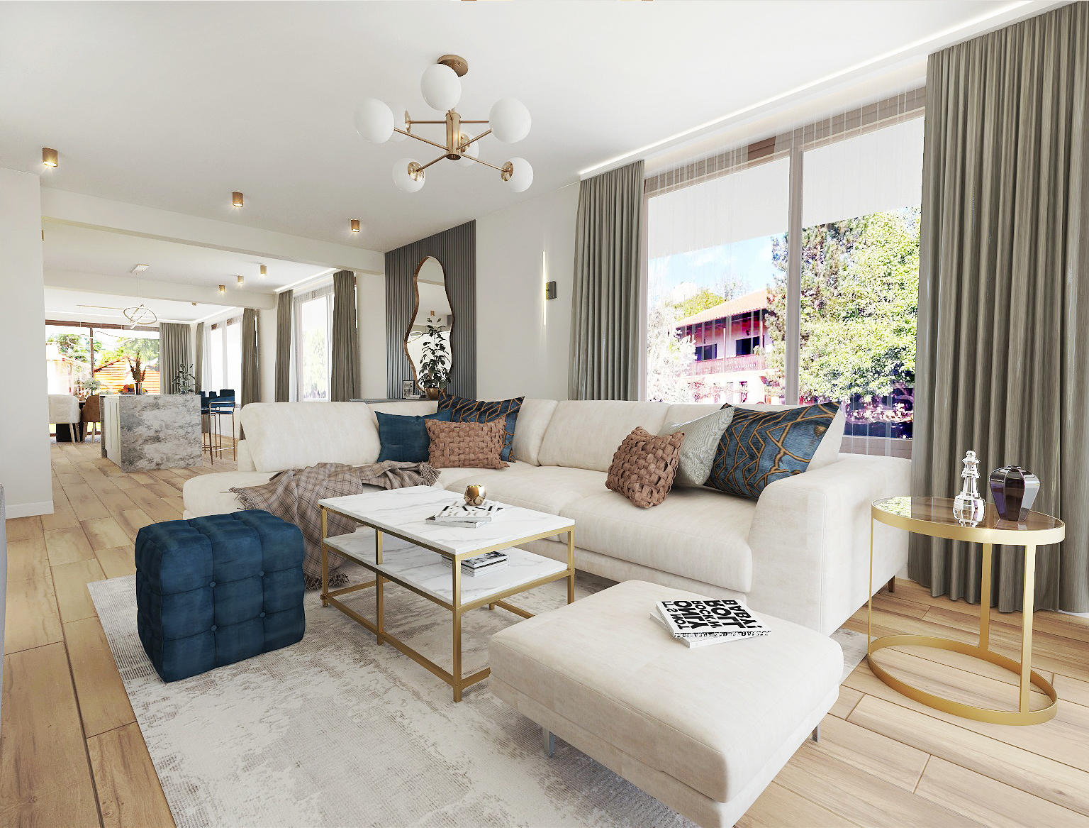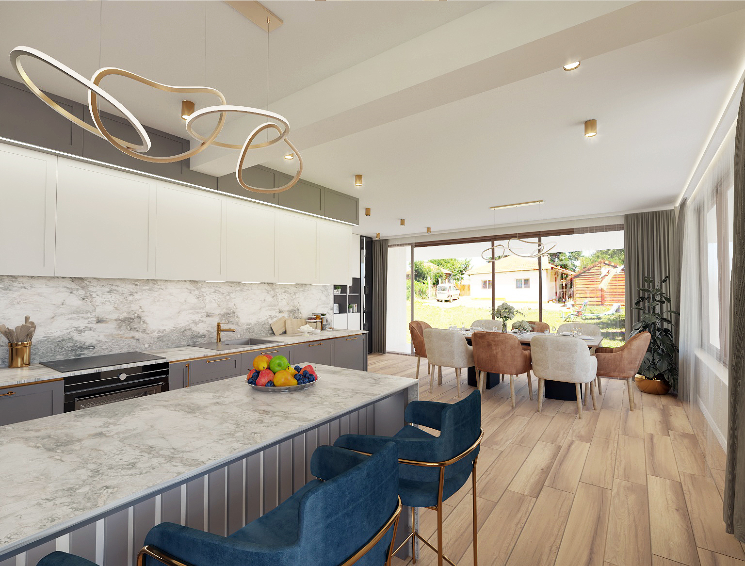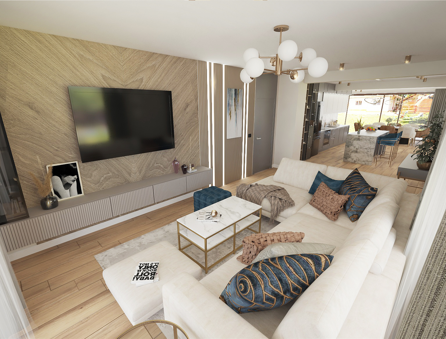 ✨ Домът, в който стилът среща уюта ✨ Добре дошли в пространството, където всяка зона разказва история – от елегантната кухня с мраморен остров и златни акценти, през светлата и уютна дневна с текстури и цветове, до спалнята, която прегръща с мекота и изисканост.Този интериор е не просто красиво подреден – той е създаден с внимание към детайла, хармония и усещане за дом.