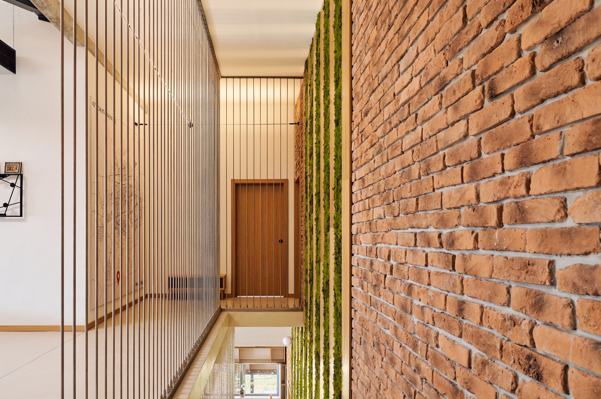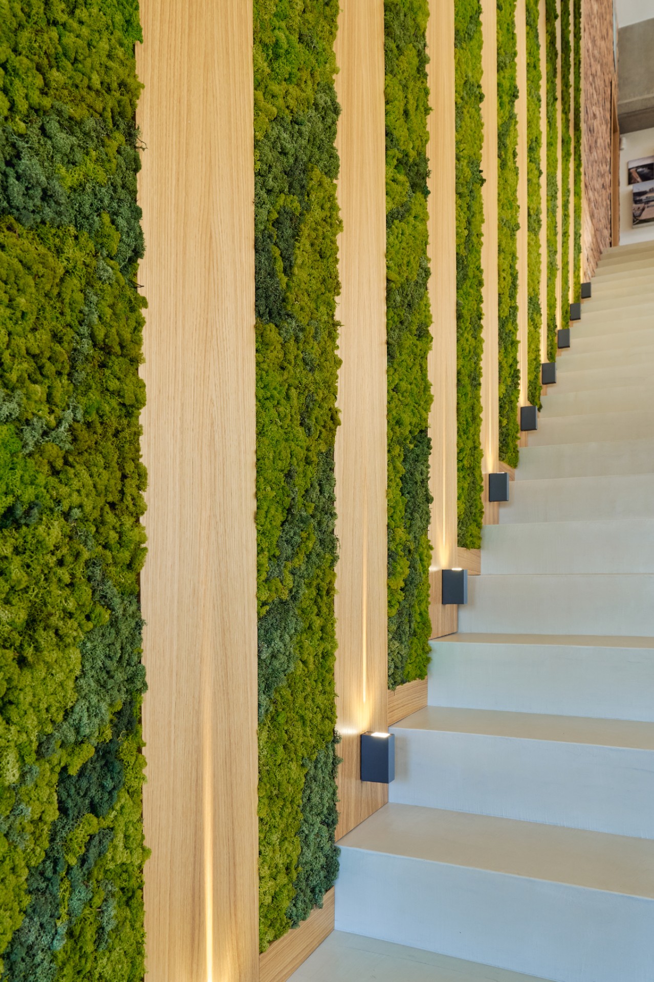 Vertical installations featuring Scandinavian moss and wooden slats bring nature into the interior and enhance the acoustics.