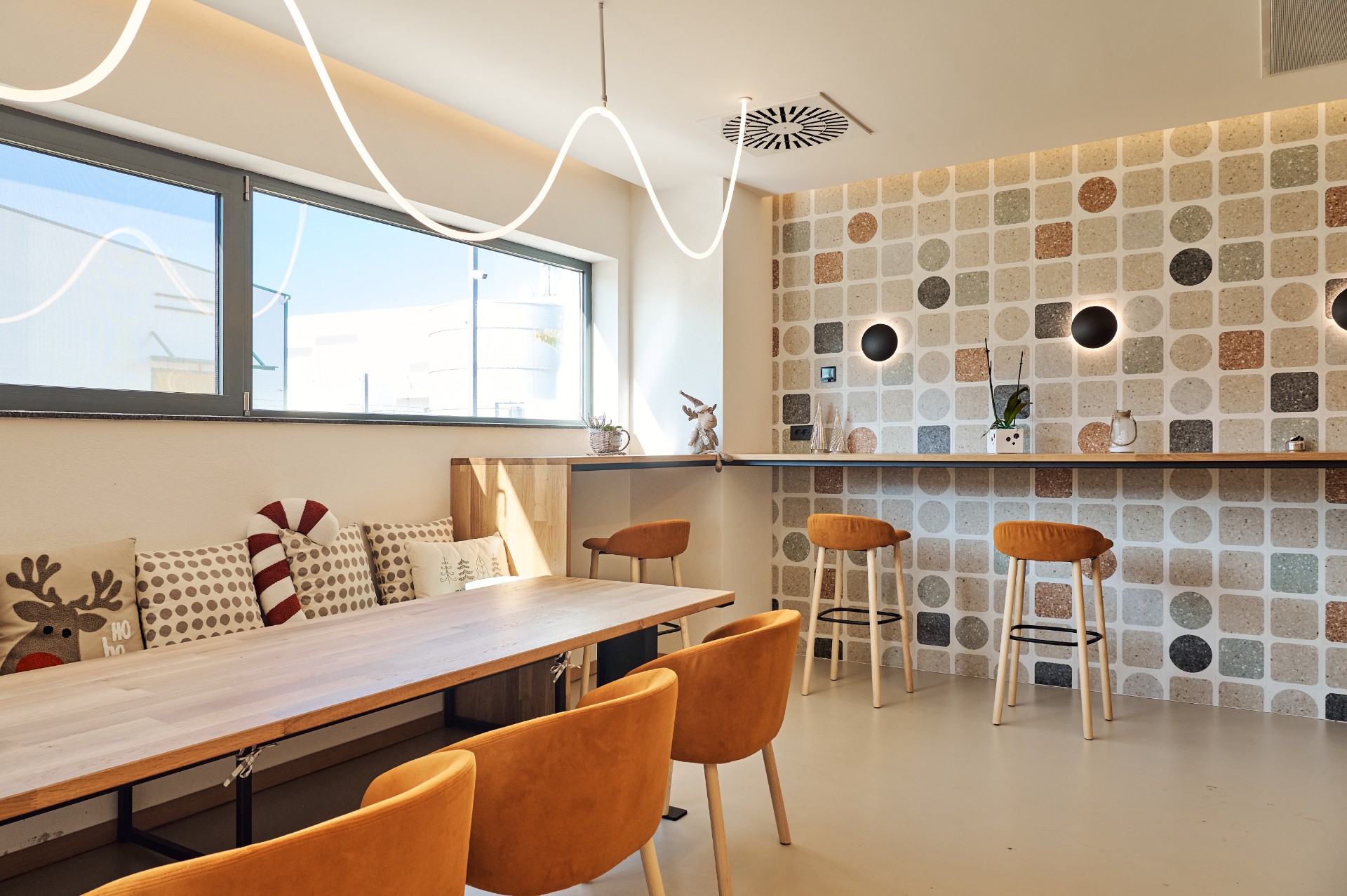 The ceiling lighting in the open spaces is executed with a linear lighting system composed of flexible tubular strips with a waterproof silicone coating, breaking up the geometry of the industrial ceiling.