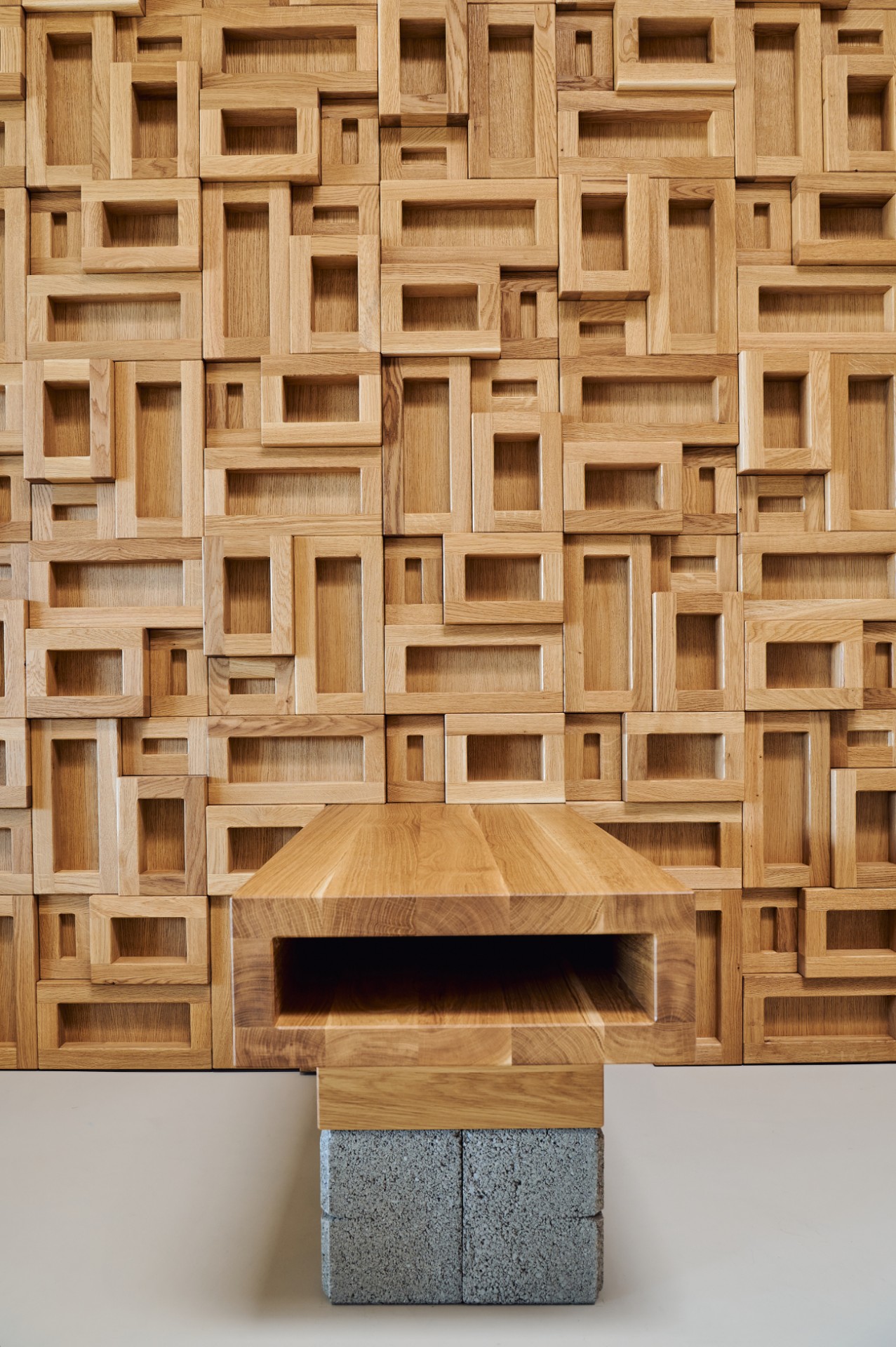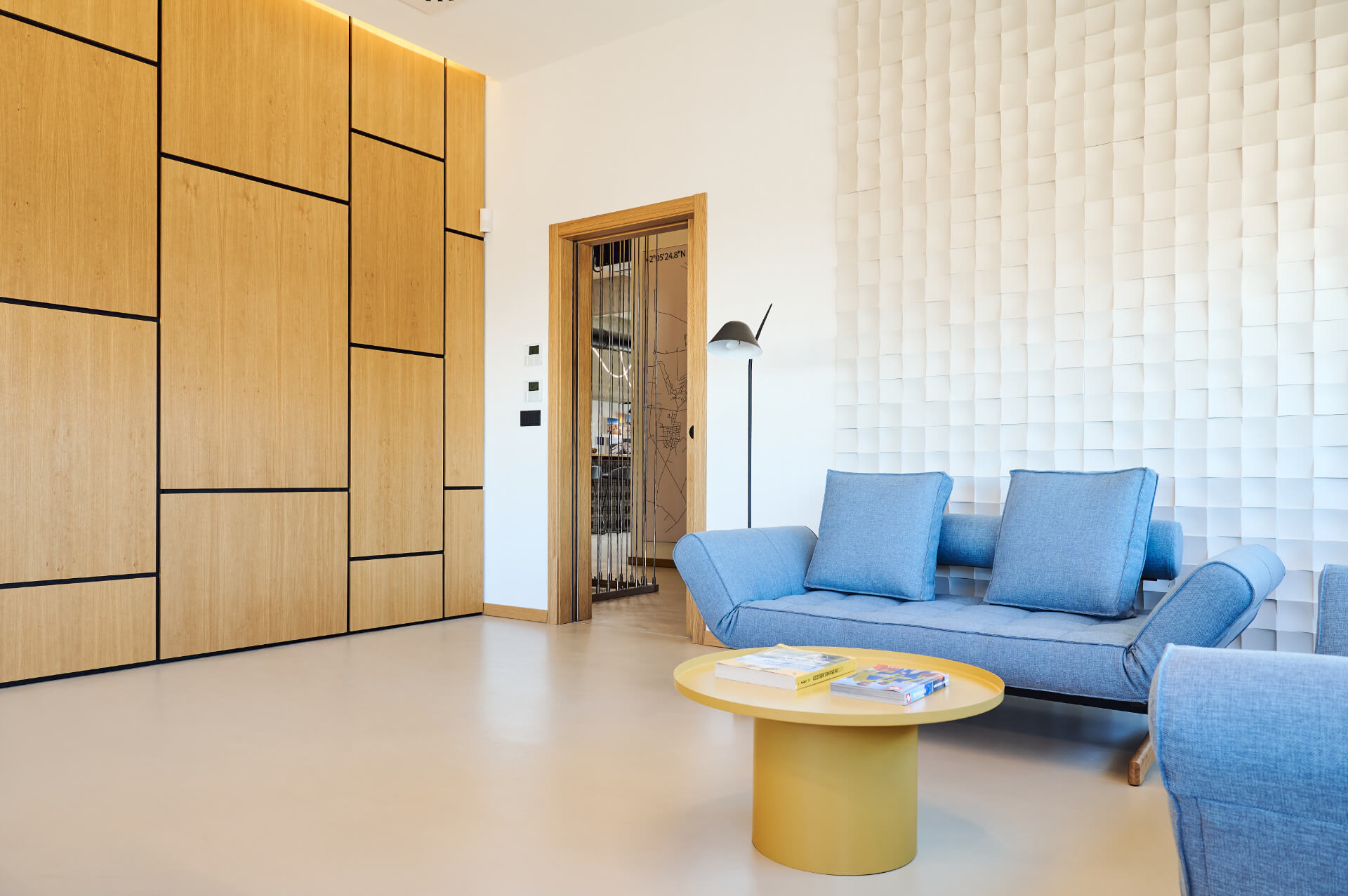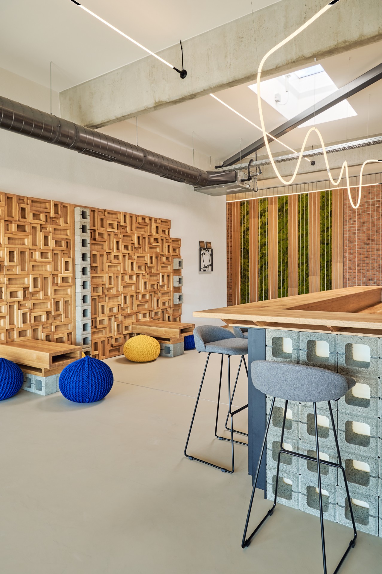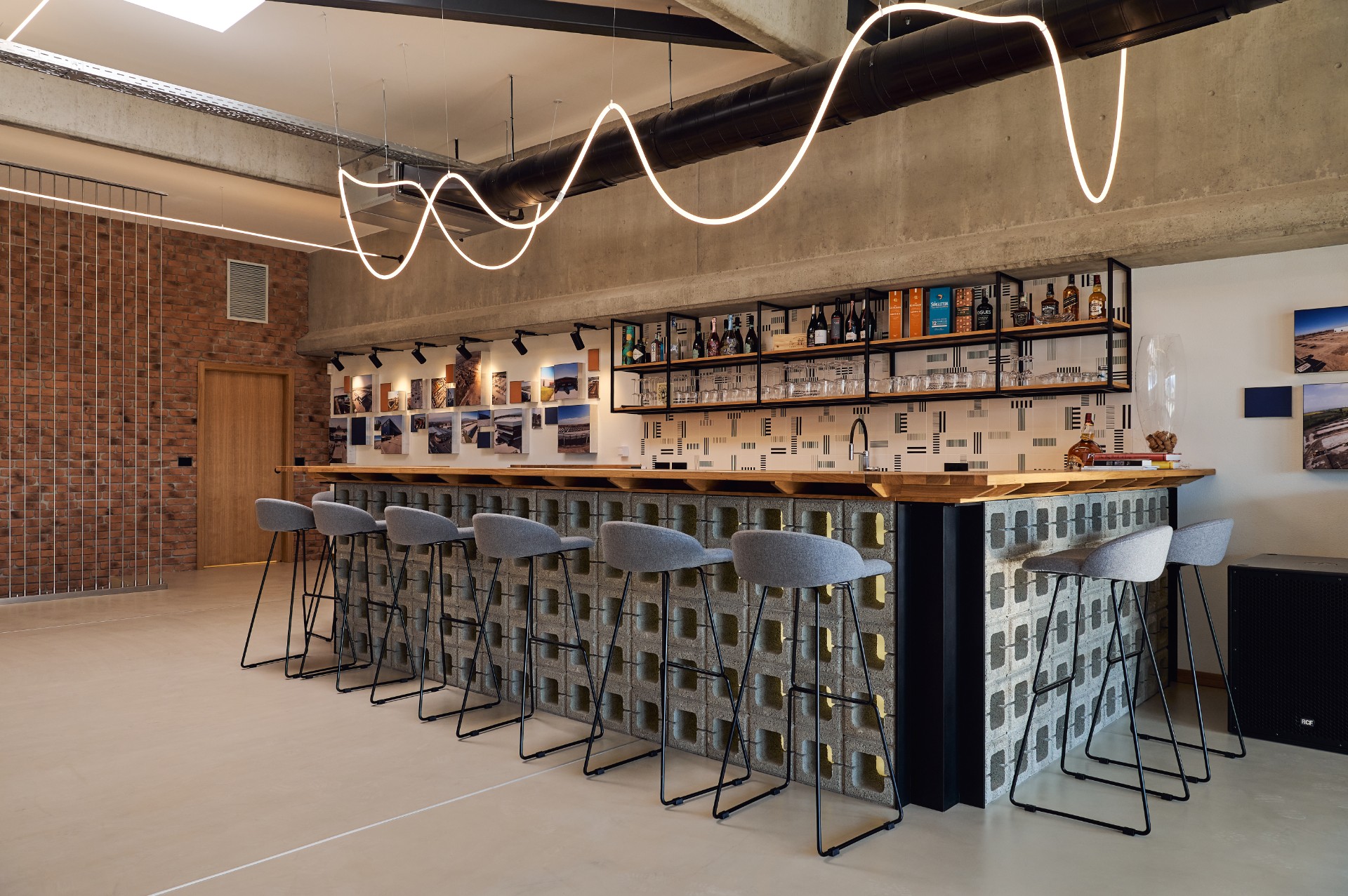A central element is the bar area, constructed from custom concrete blocks with a wooden countertop – a place for informal meetings and relaxation.