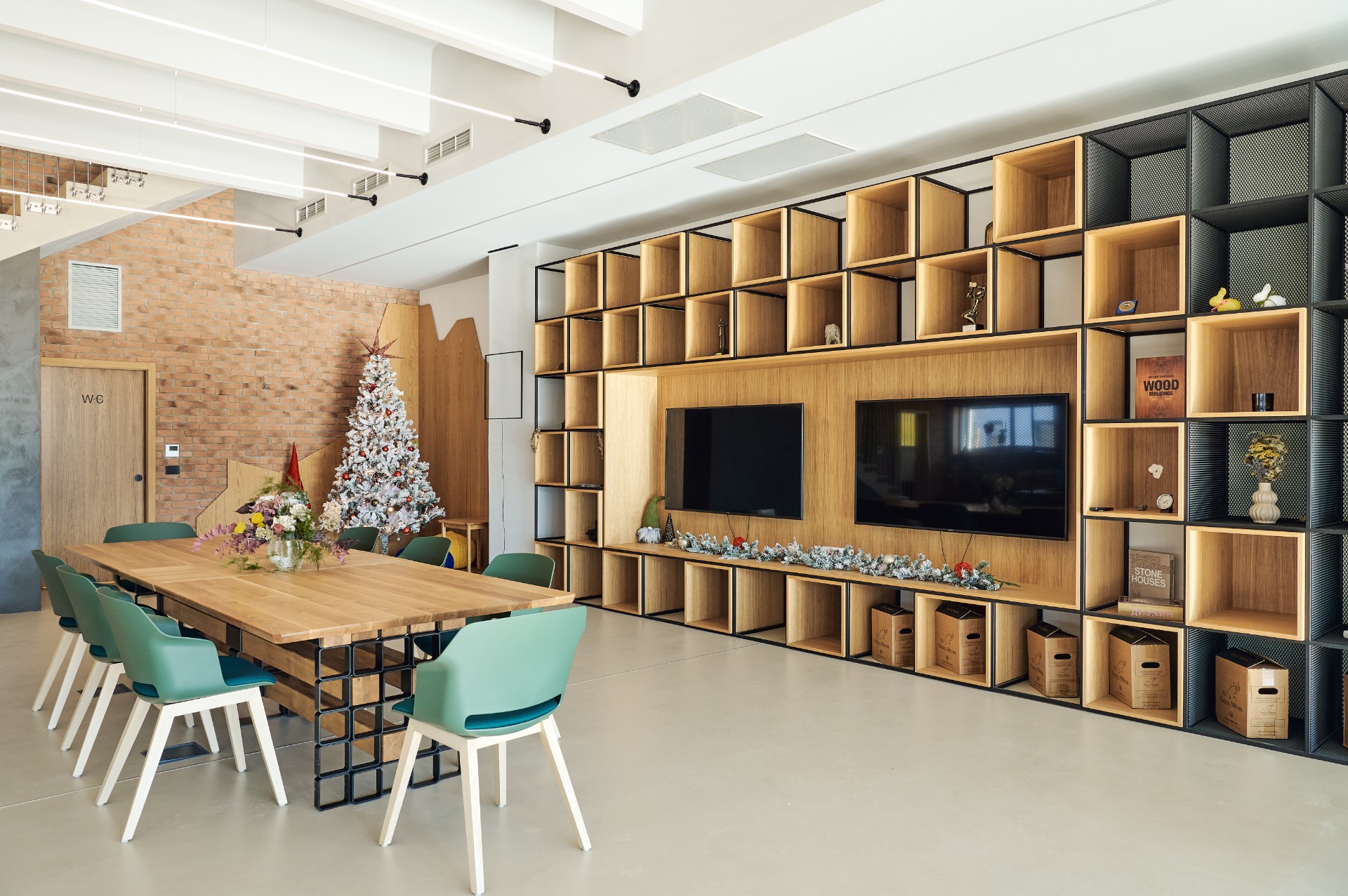 Located in Plovdiv, this modern office space redefines the traditional work environment by artfully blending raw industrial aesthetics with the warmth of natural materials. The design relies on the honesty of materials. The rough texture of the exposed concrete and red bricks contrasts with the smoothness of the natural wood veneer and the microcement flooring.